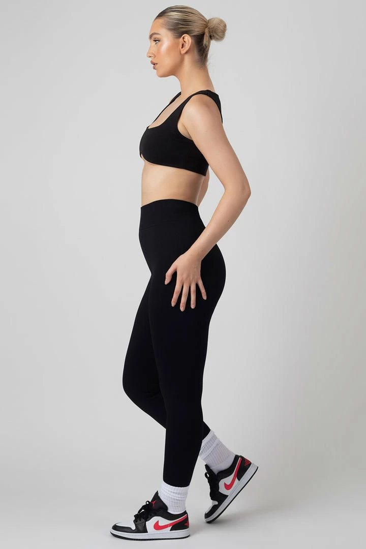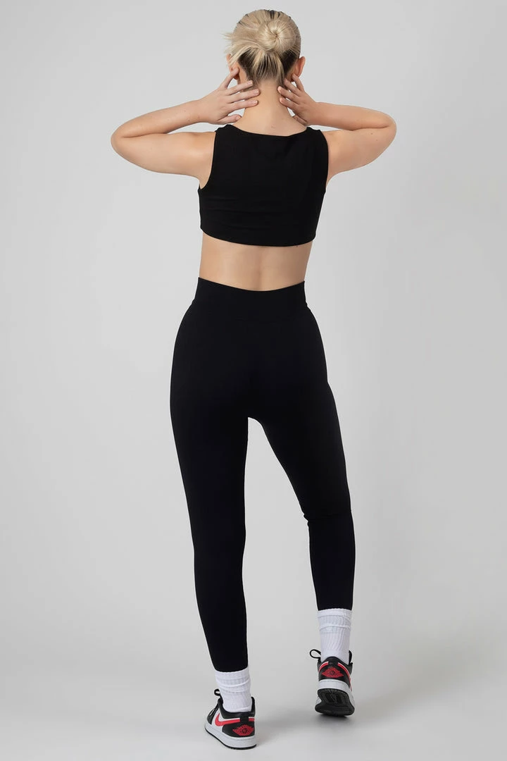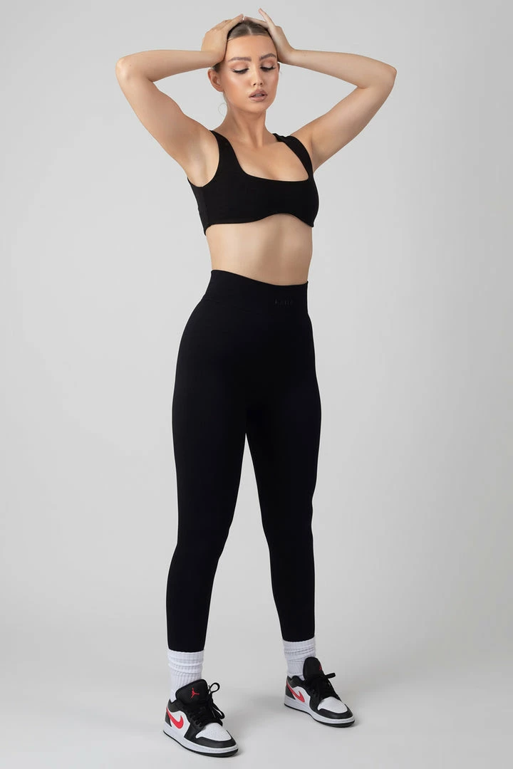 Seamless ribbed leggings in black with a logo detail on the front.