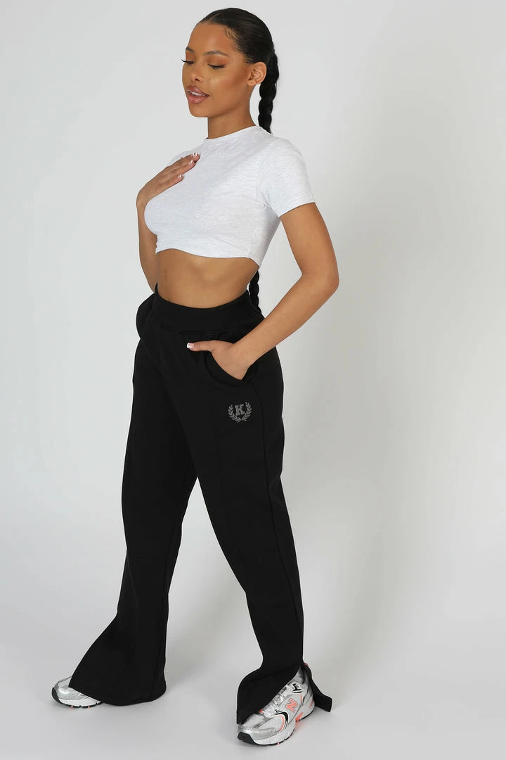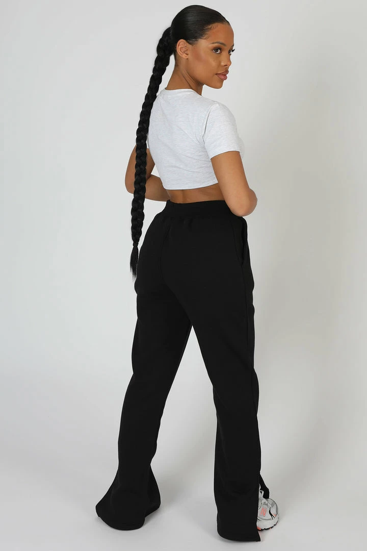 Straight leg black joggers split hems and seams with an elasticated waist.