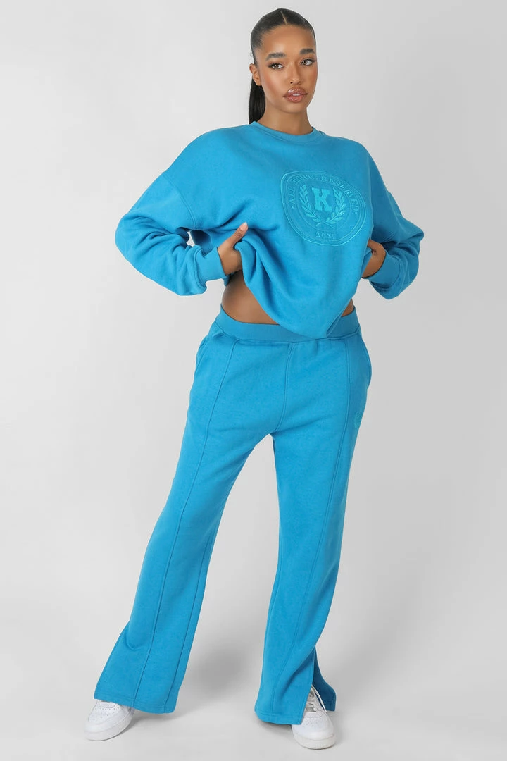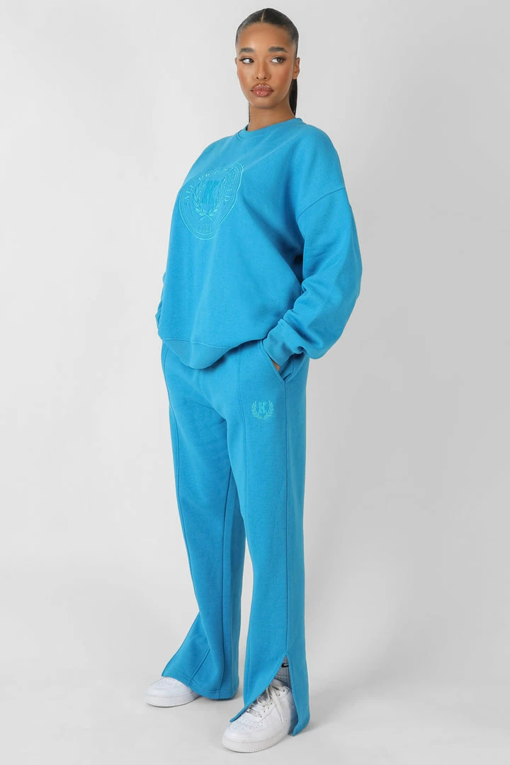 Straight leg blue joggers split hems and seams with an elasticated waist.