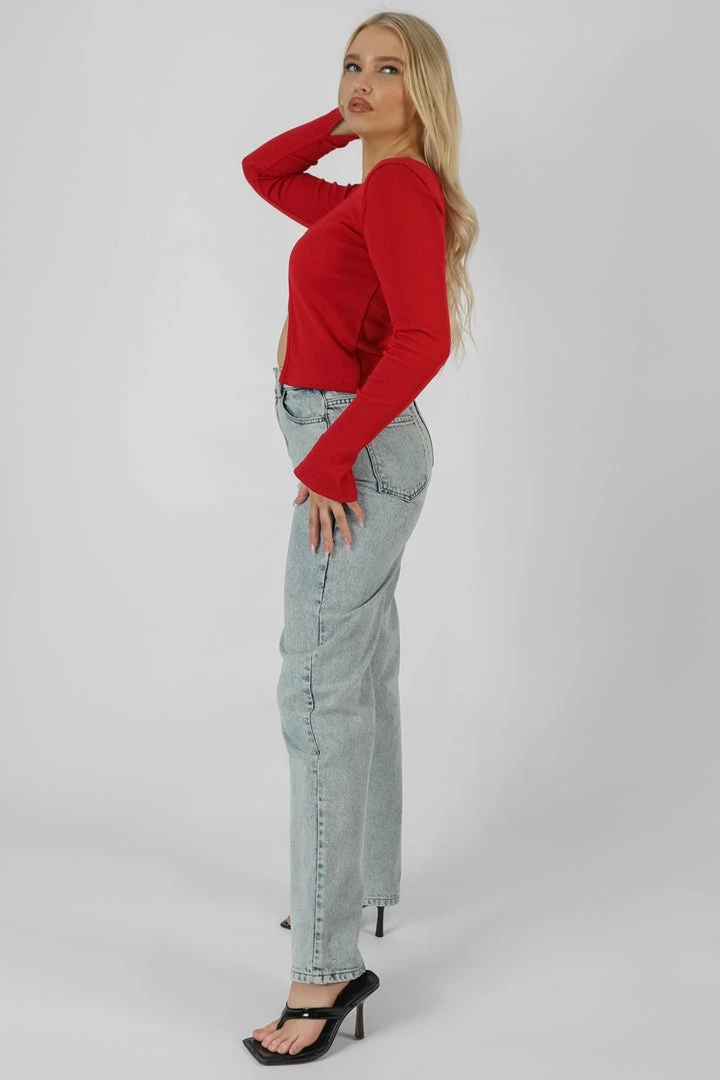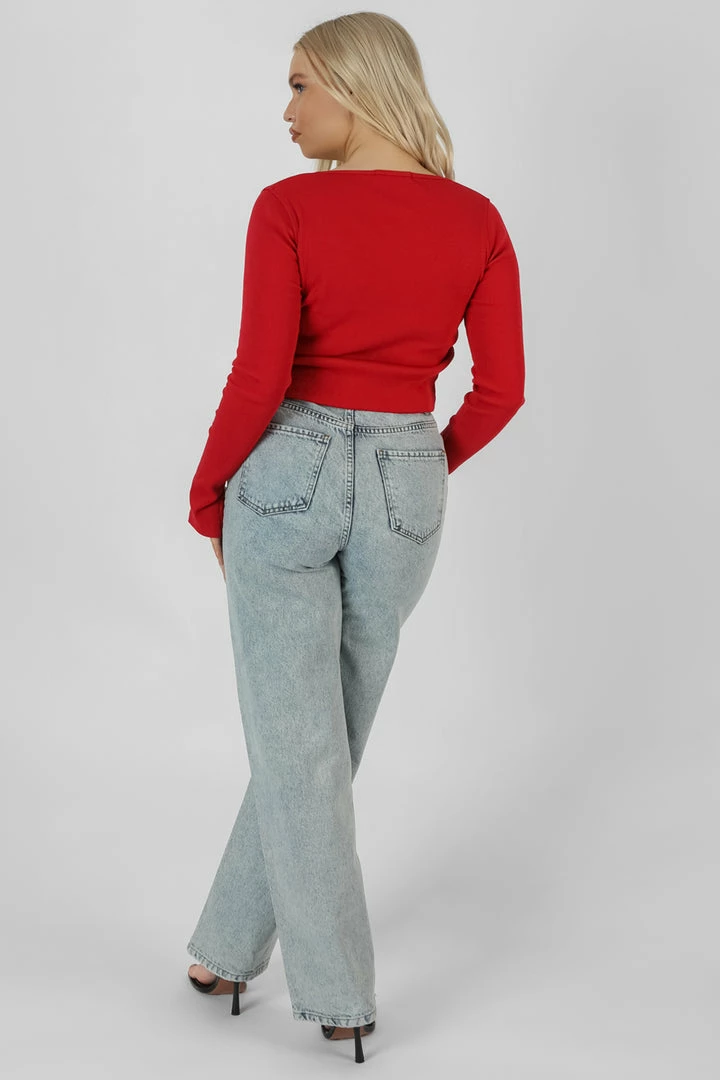 A SLIGHTY CROPPED LONG SLEEVE CLOSED CARDIGAN IN RED WITH A KAIIA PIN HOLDING IT TOGETHER.