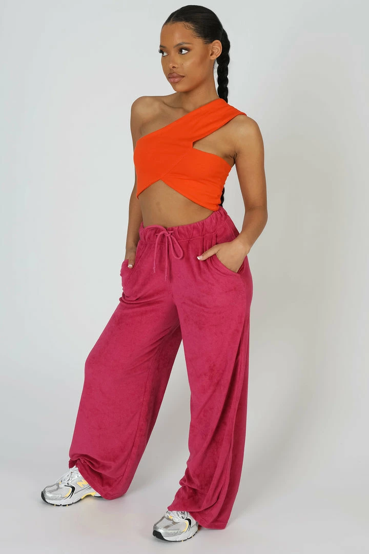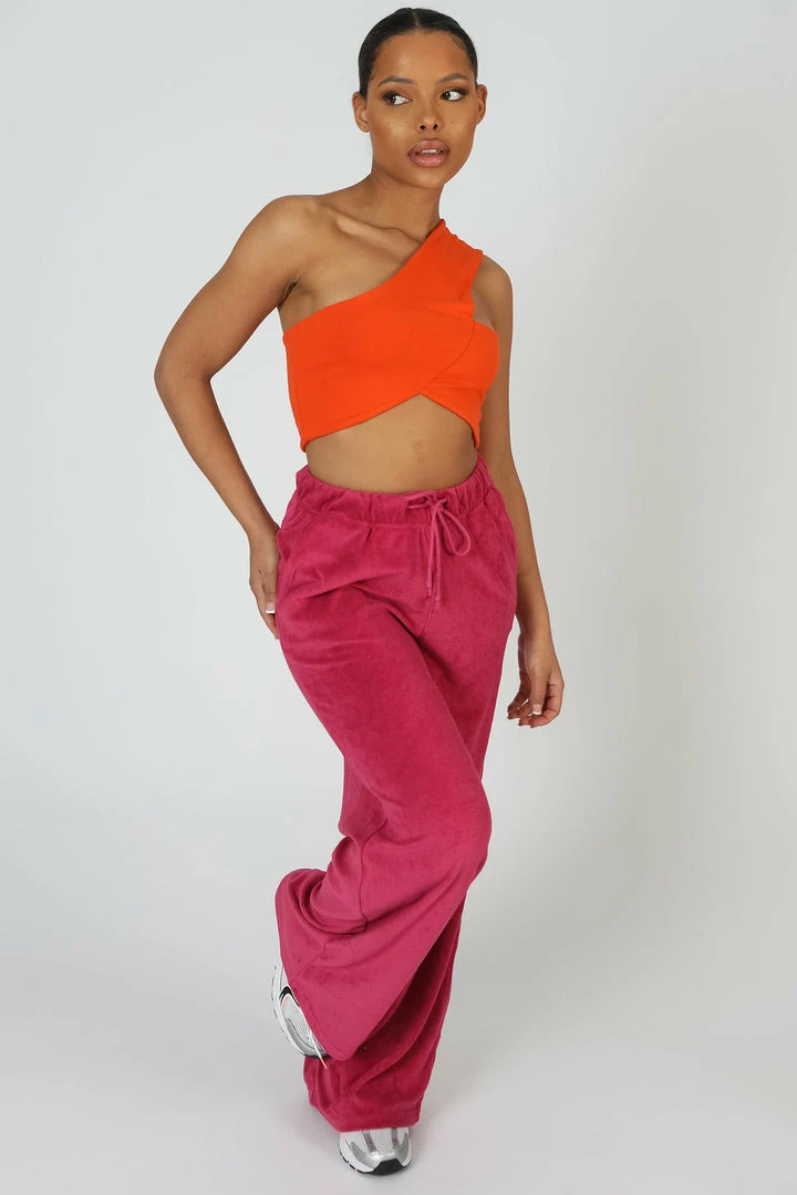 A bralet in orange with an asymetric strap and upside down v shape on them hem..