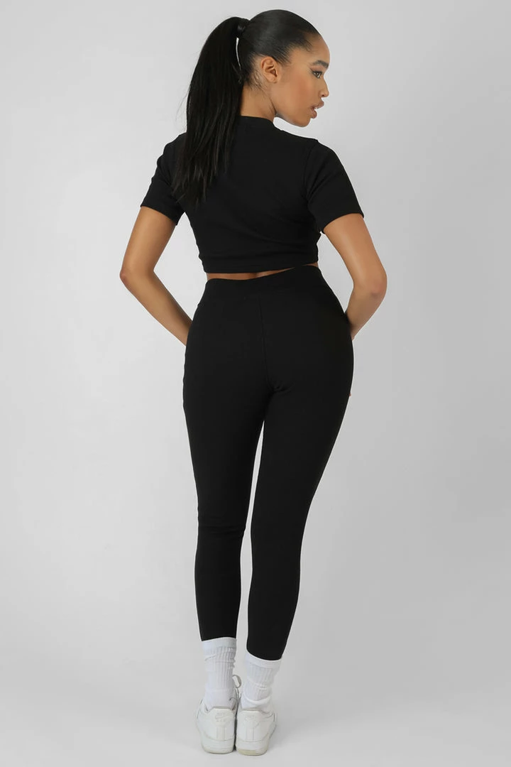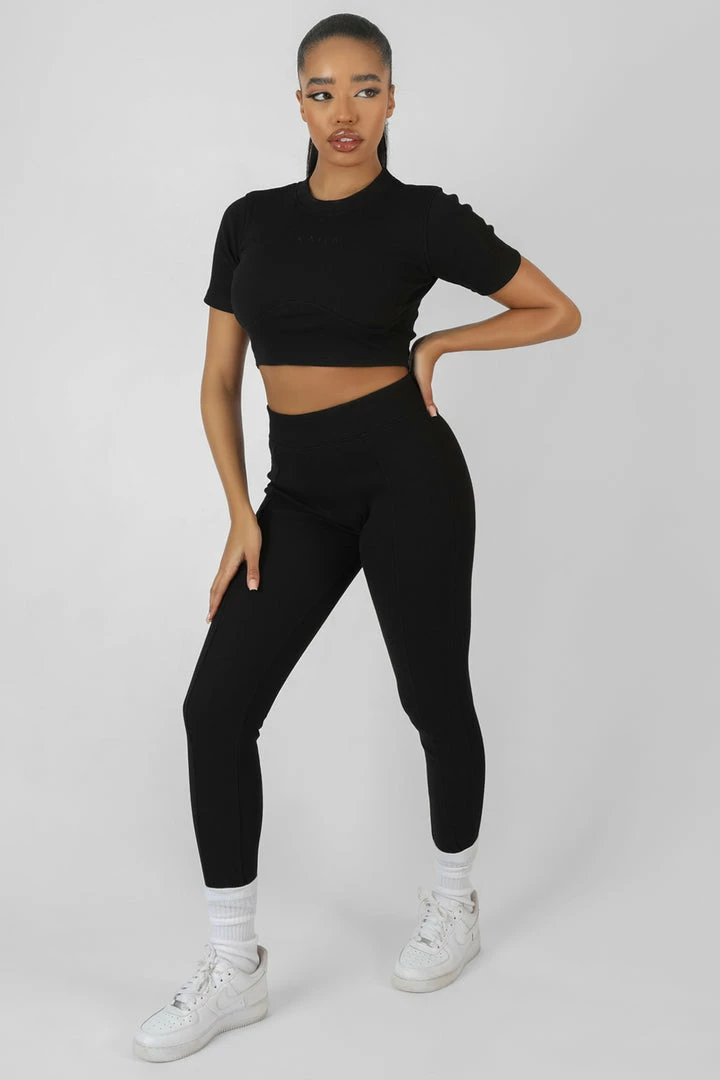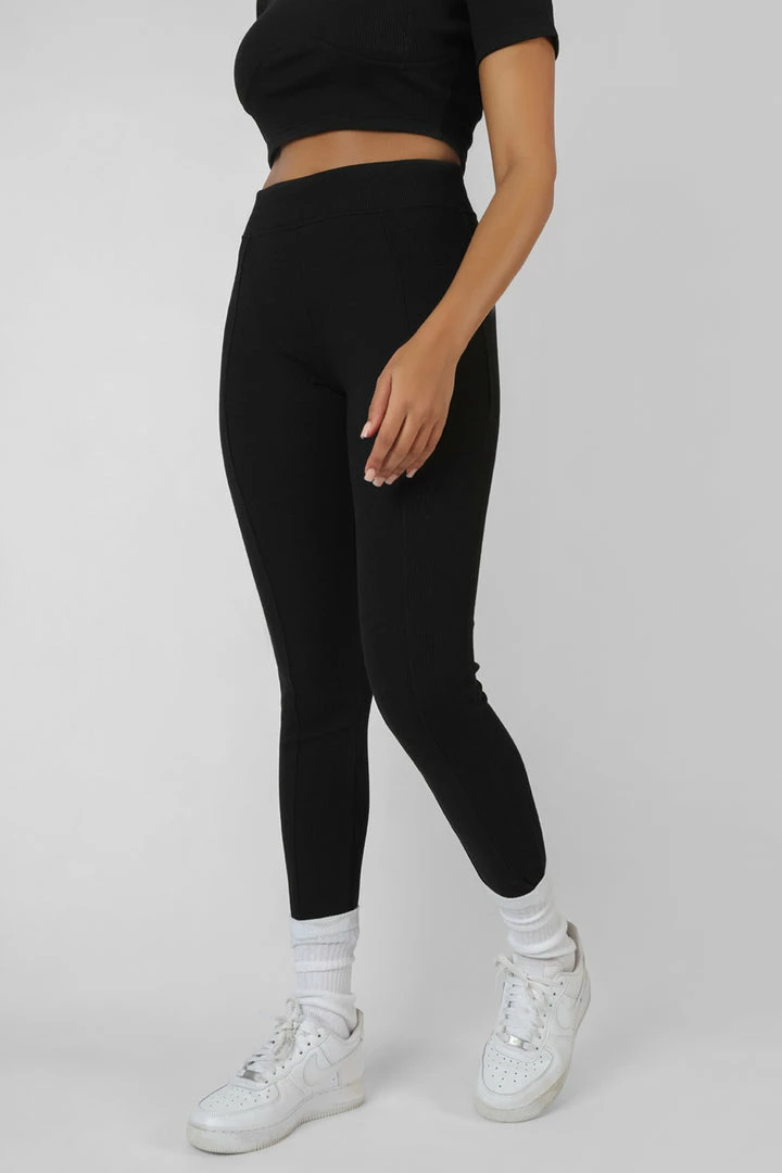 ATHLEISURE WEAR STYLE BLACK RIBBED HIGH WAISTED LEGGINGS WITH SEAM FRONT DETAILING.
