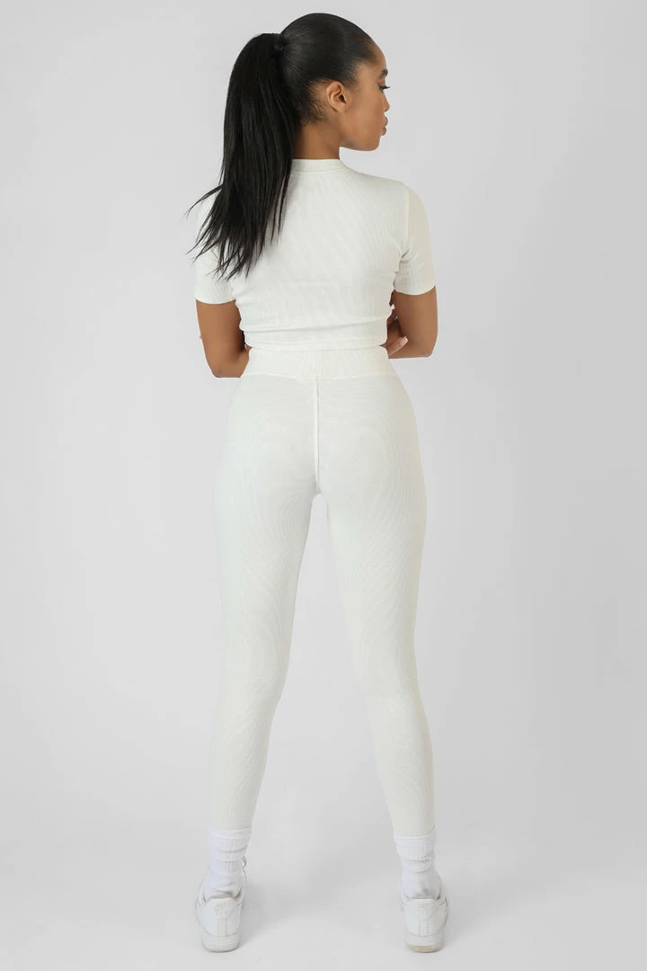 AN ATHLEISURE WEAR STYLE RIBBED WHITE CROP TOP WITH UNDERBUST DETAILING, TONAL KAIIA EMBROIDERY AND CAP SLEEVES