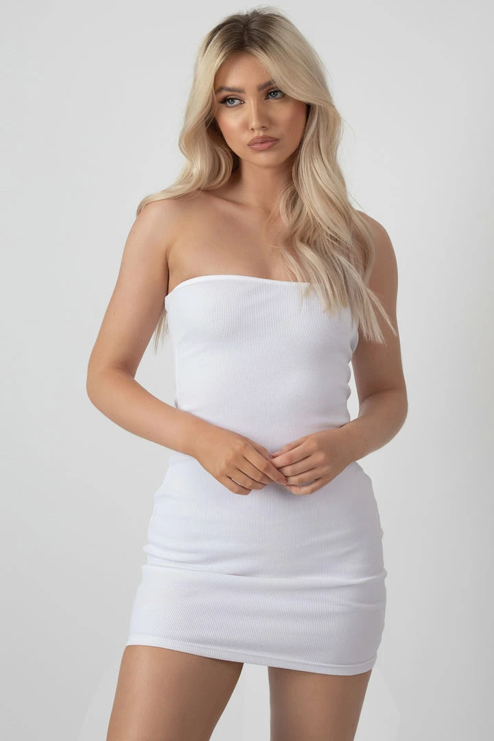 A strapless bandeau bodycon dress in white made of a thick ribbed material