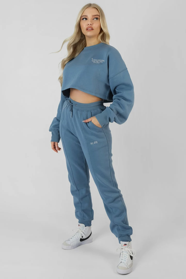OVERSIZED FIT JOGGERS IN BLUE WITH BE YOUR OWN MUSE PRINTEDN ON IN A WAVEY PATTERN. PAIR WITH THE BE YOUR OWN MUSE WAVE PRINT JOGGER FOR THE ULTIMATE SET.