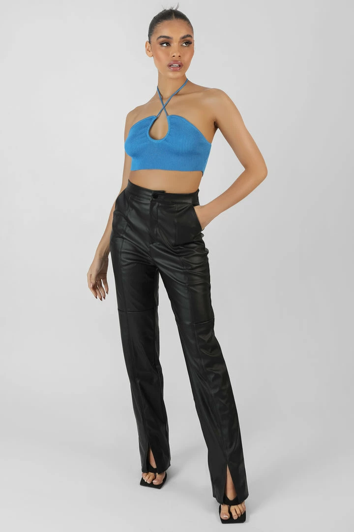 A knitted crop top bralet with a cut out detail and crossover halter-neck strap in blue.
