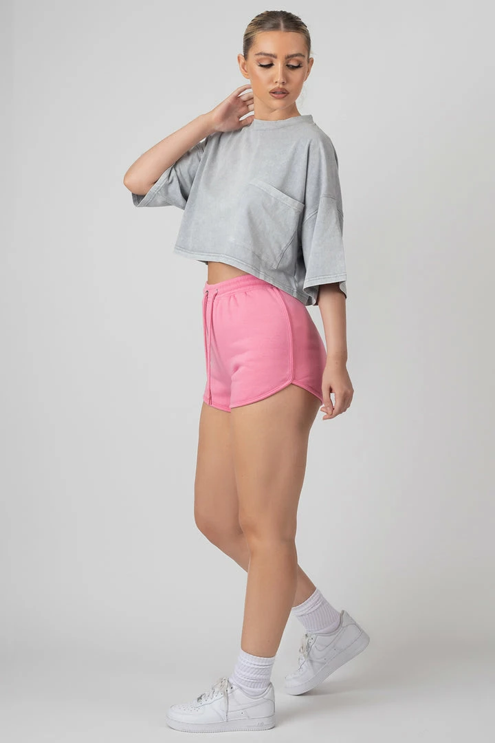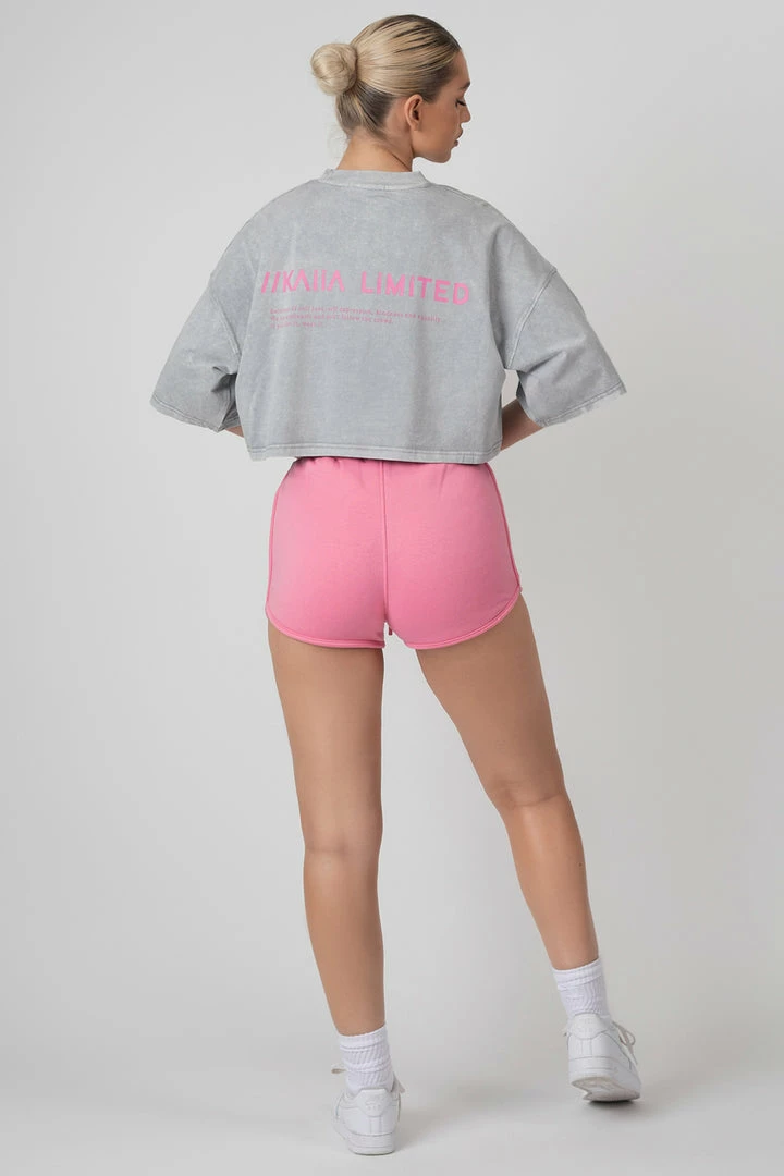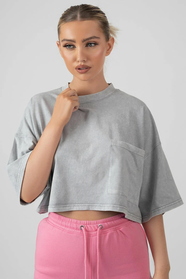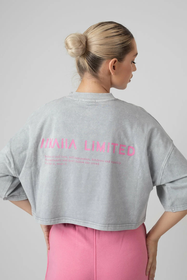 A boxy oversized fit crop top in grey with short sleeves and printing details on the back.