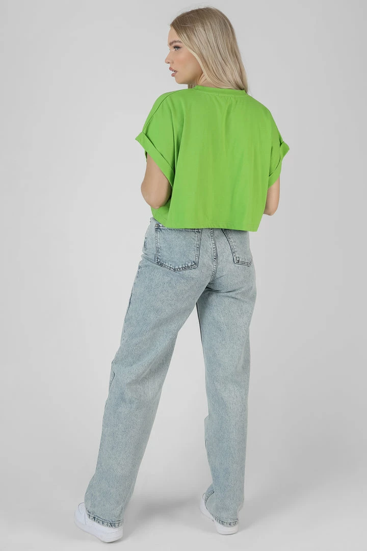 A boxy oversized fit crop top WITH SHORT SLEEVES in green with white embroidery on the front.