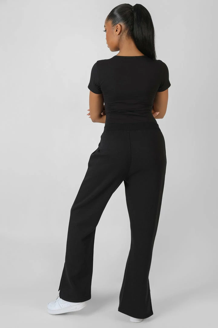 A cap sleeved t-shirt thong bodysuit in black with clasps.