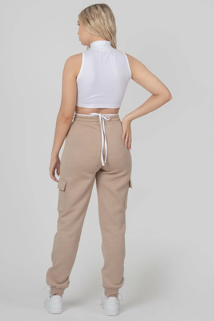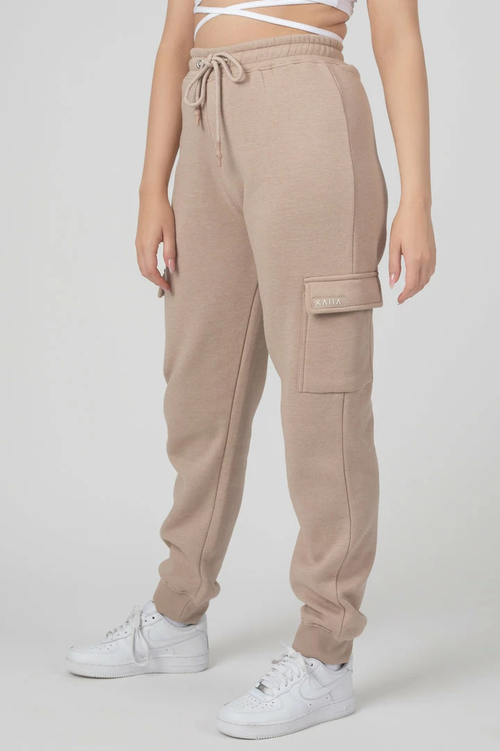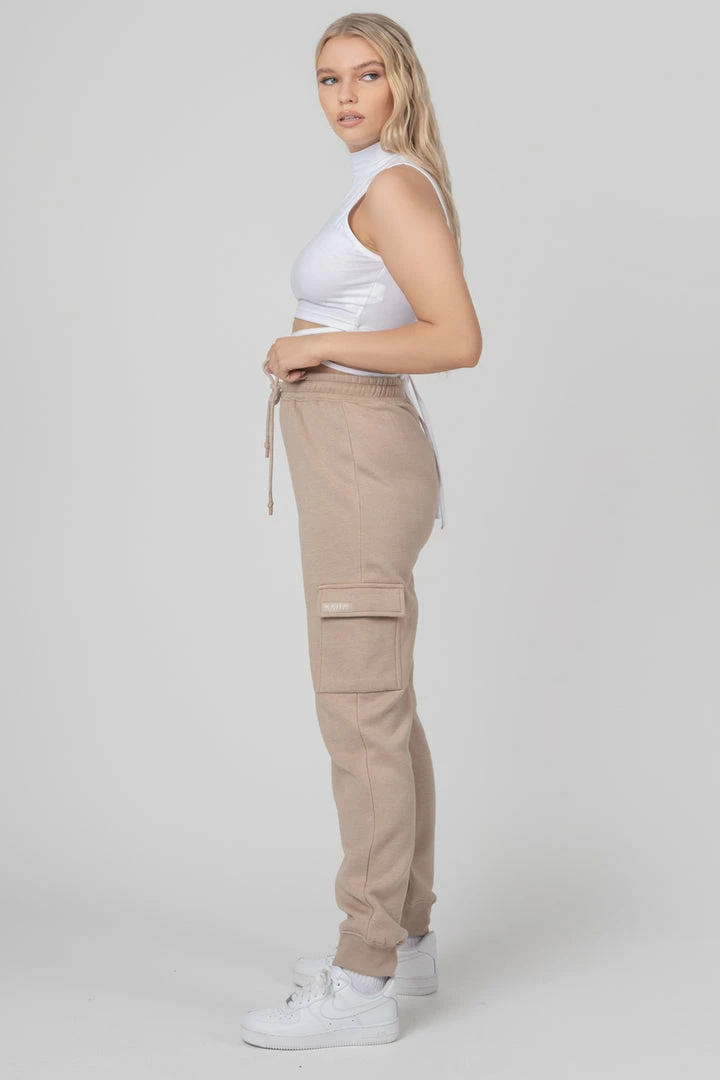 A jogger in a light taupe colour with side pockets and an elasticated waist and cuffs