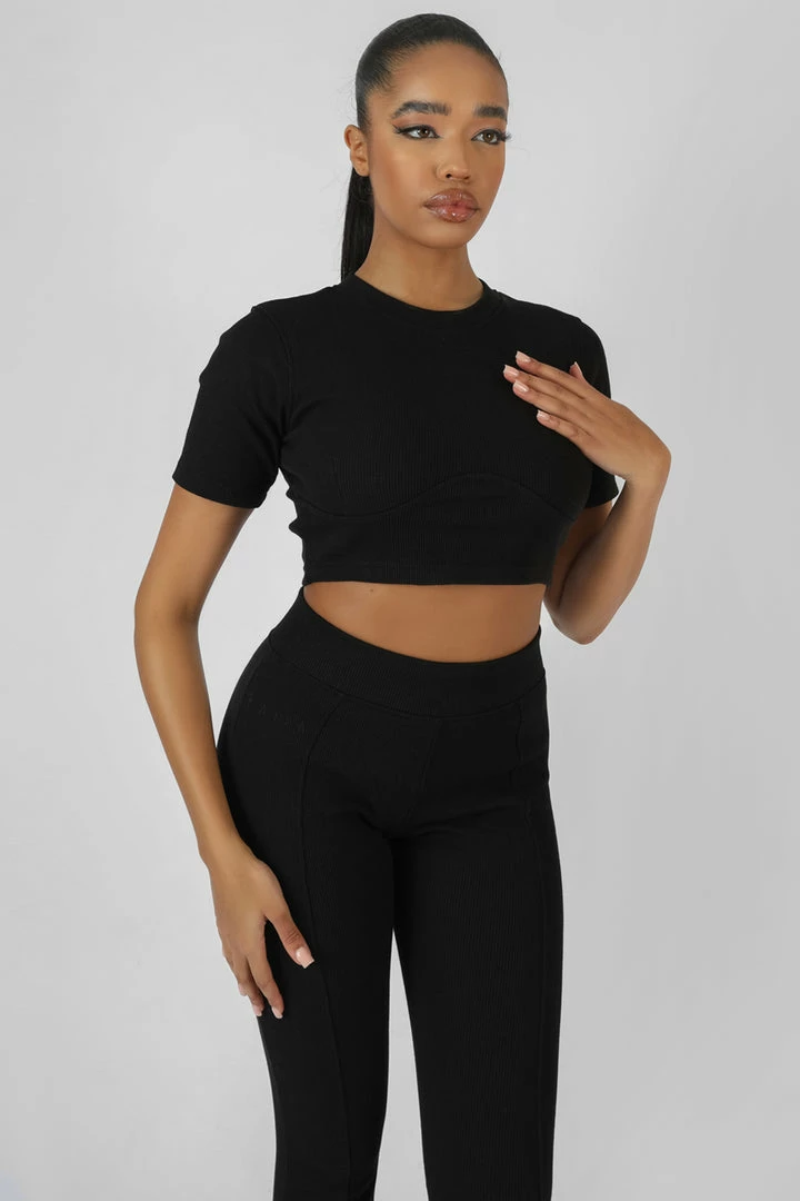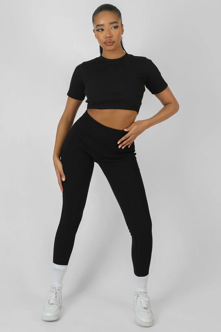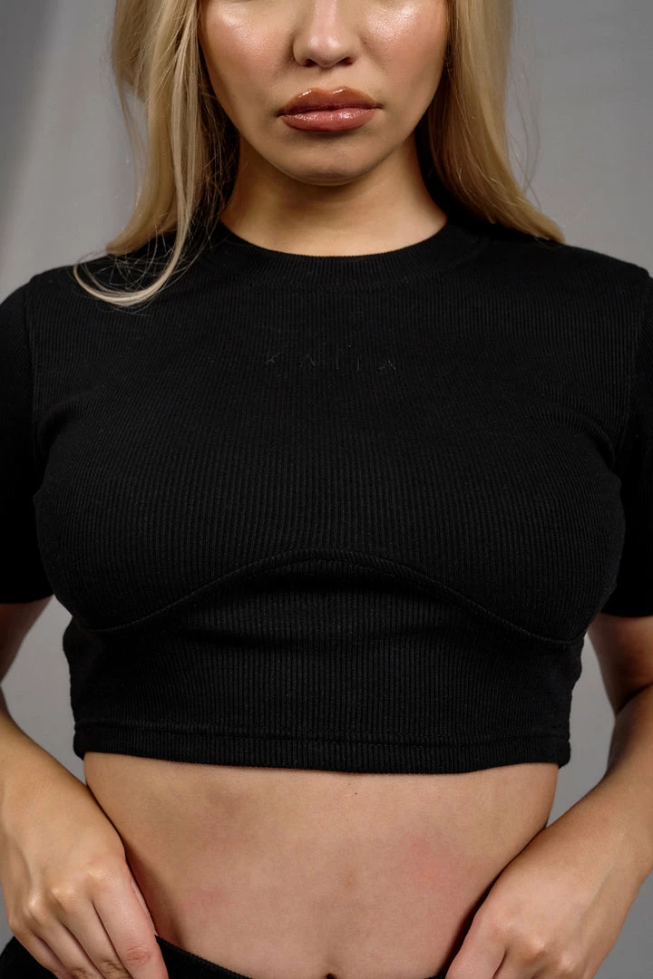 AN ATHLEISURE WEAR STYLE RIBBED BLACK CROP TOP WITH UNDERBUST DETAILING, KAIIA EMBROIDERY AND CAP SLEEVES