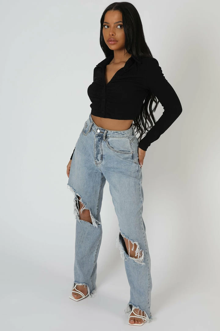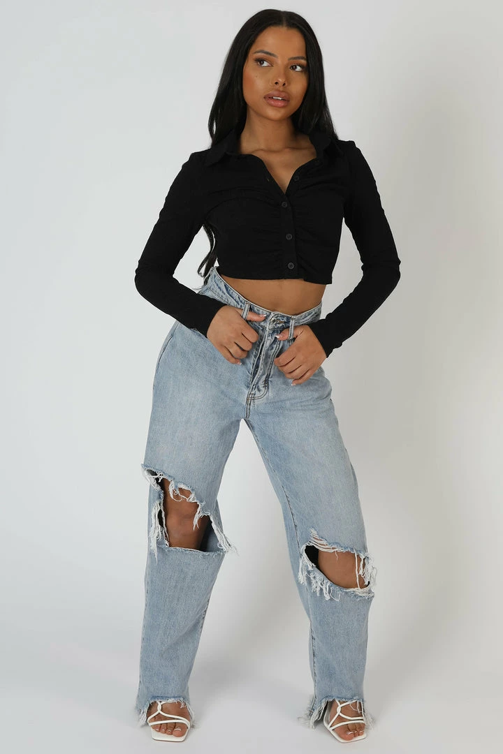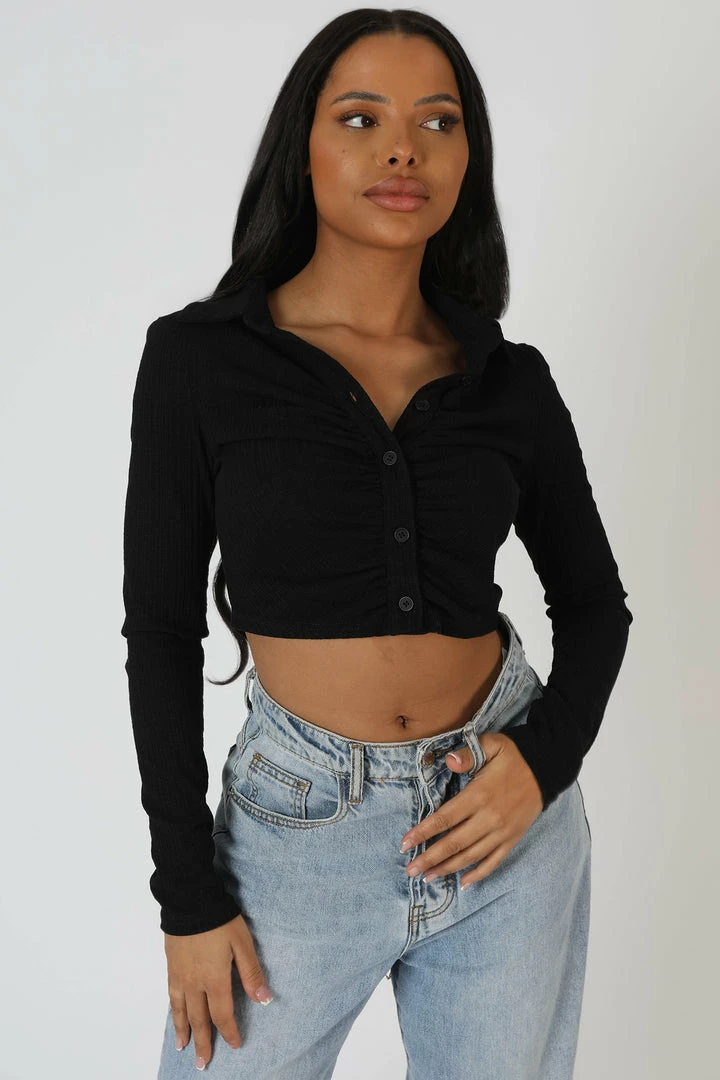 A BUTTON UP FRONT CROP TOP IN BLACK FEATURING FLATTERING RUCHING AND A COLLAR.