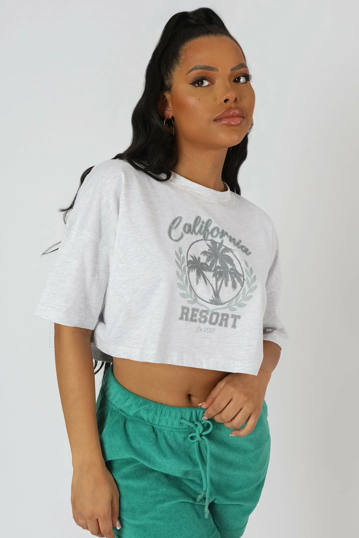 A SUPER CROPPED T-SHIRT IN OATMEAL MARL WITH CALIFORNIA RESORT PRINTED ON THE FRONT