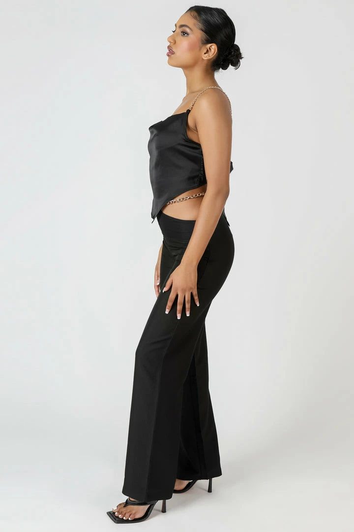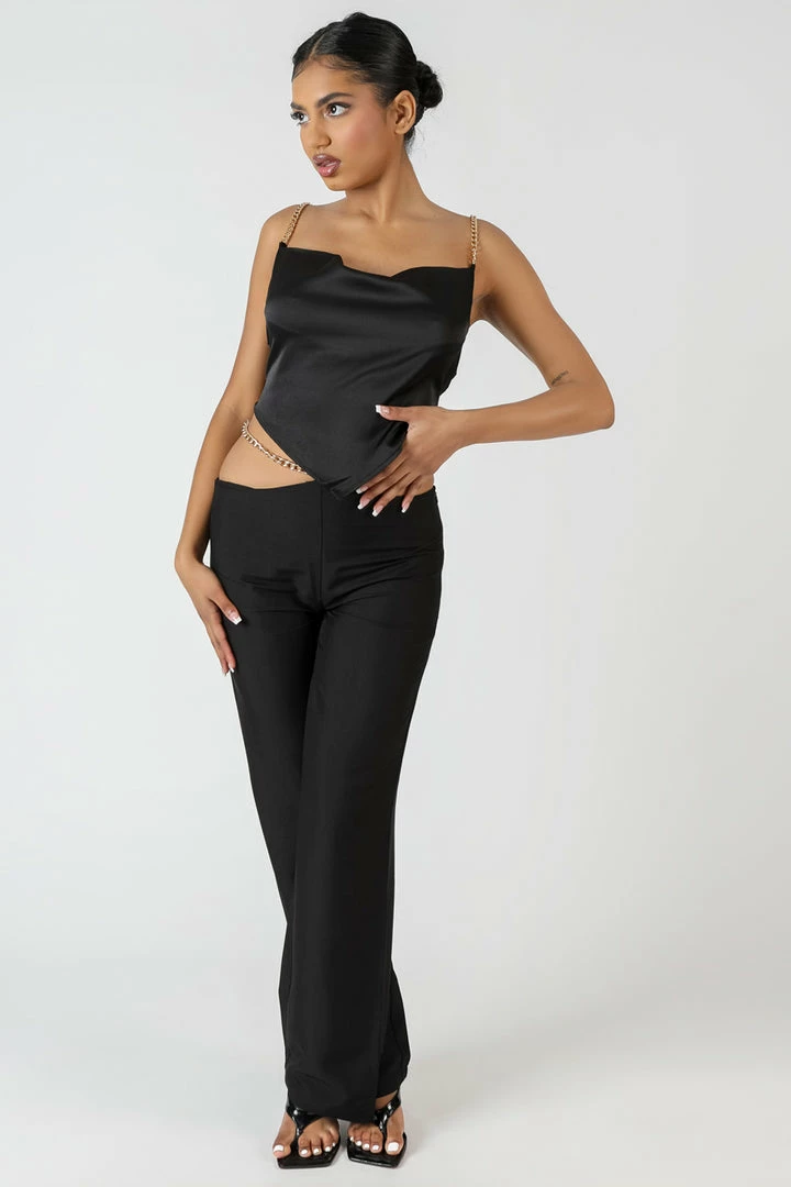 Upgrade your Autumn style with this handkerchief style top with chain detail straps in a black material.