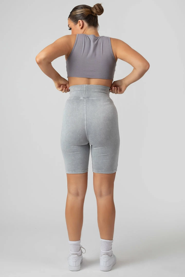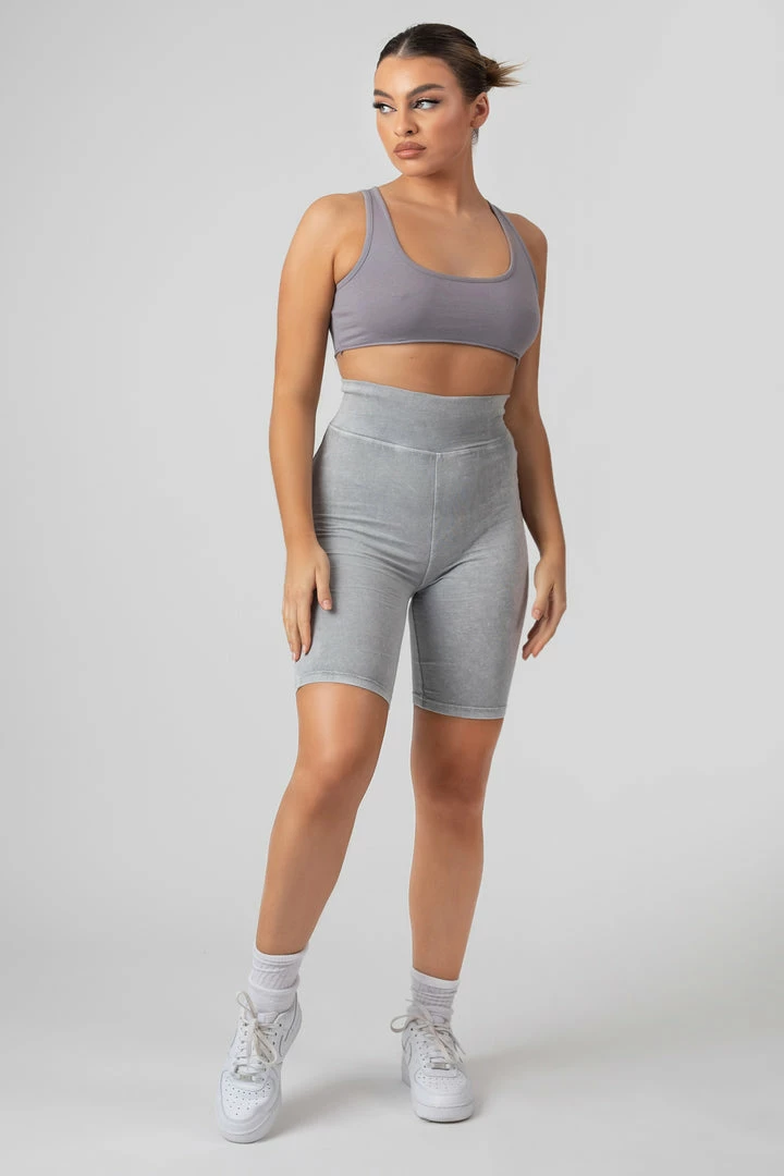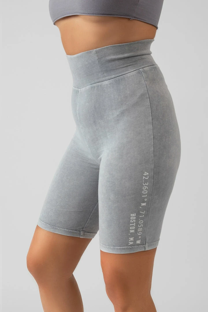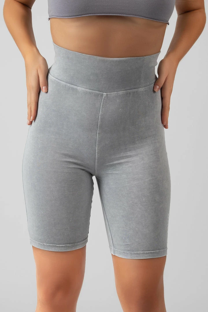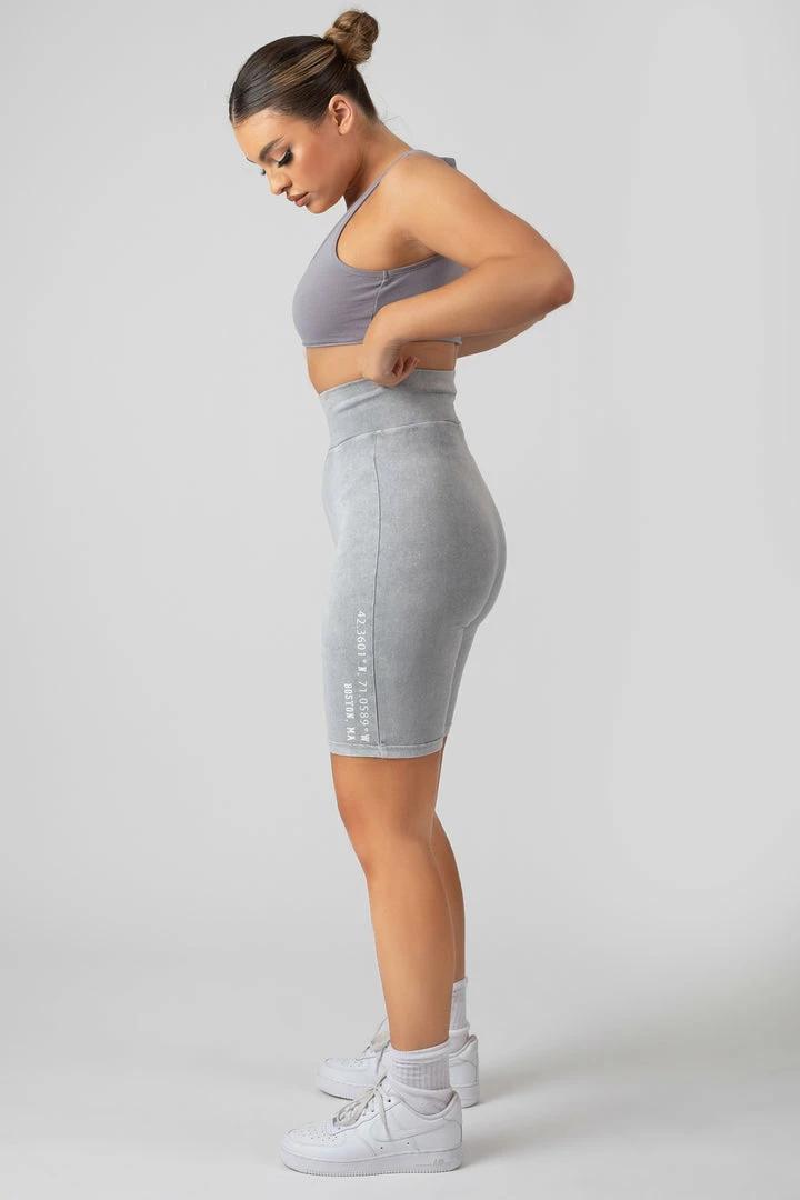 Cycling shorts in a grey acid wash with printing details down one of the legs.