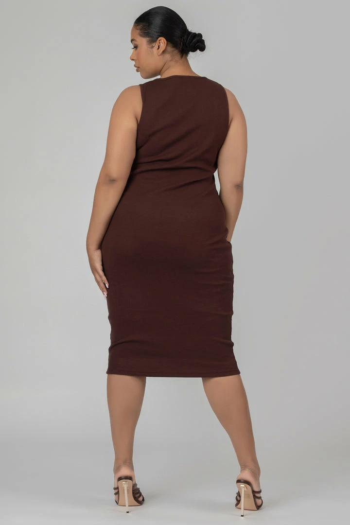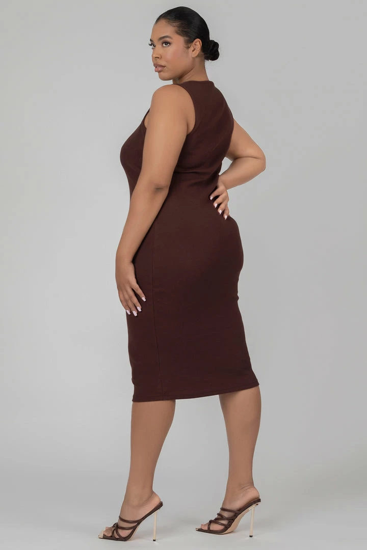 RIBBED MIDI DRESS WITH THICK STRAPS AND SCOOP NECK LINE IN CHOCOLATE.