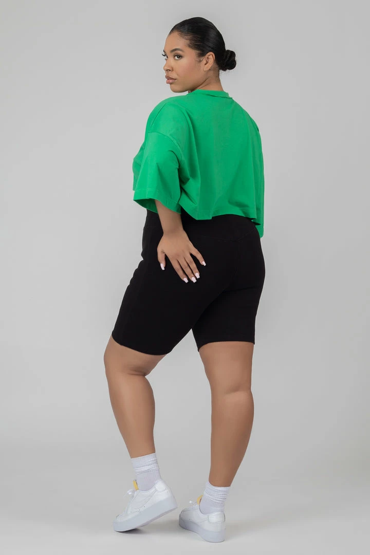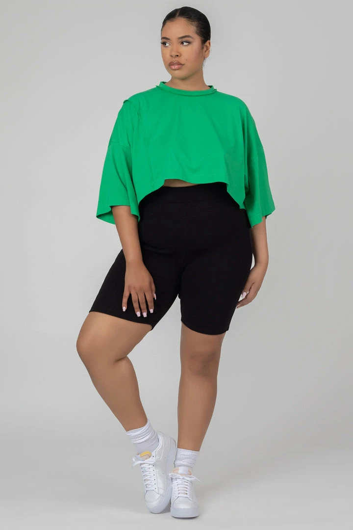 An oversized fit crop top in green with exposed seams.