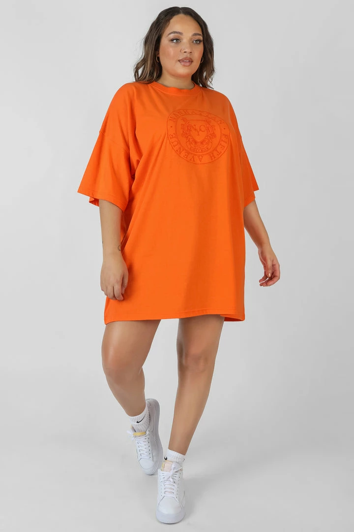An oversized fit t-shirt dress in orange with tonal embroidery.