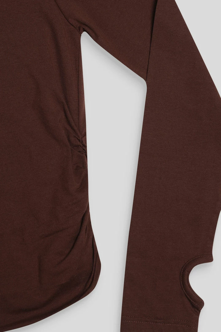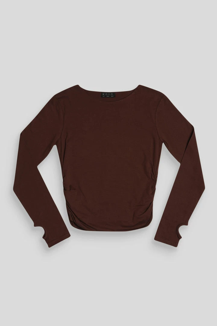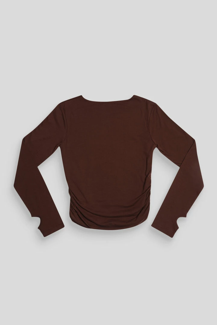 A LONG SLEEVE SLIGHTY CROPPED T-SHIRT IN CHOCOLATE WITH FLATTERING RUCHING DOWN THE SIDES. PAIR WITH THE MATCHING V FRONT KNICKER IN CHOCOLATE FOR THE ULTIMATE SET.ย