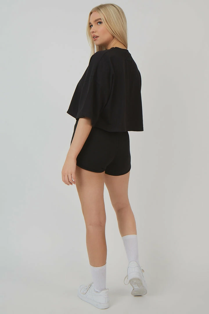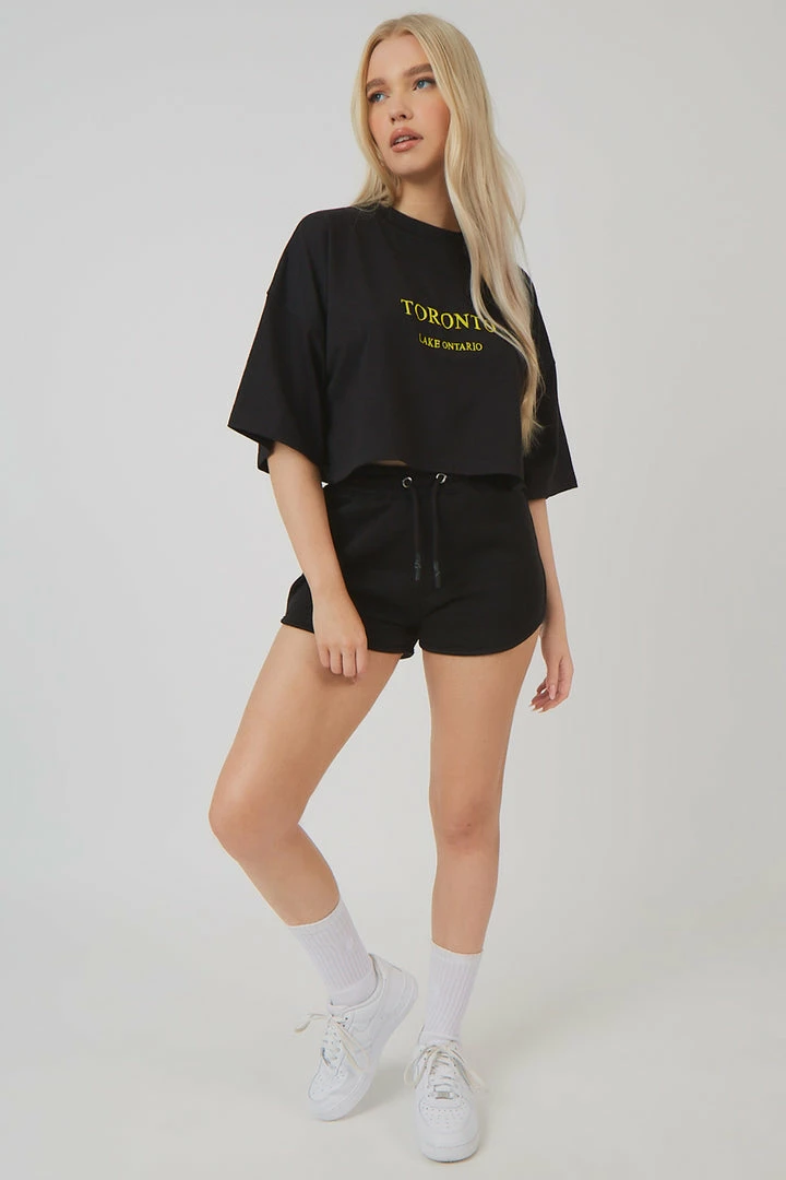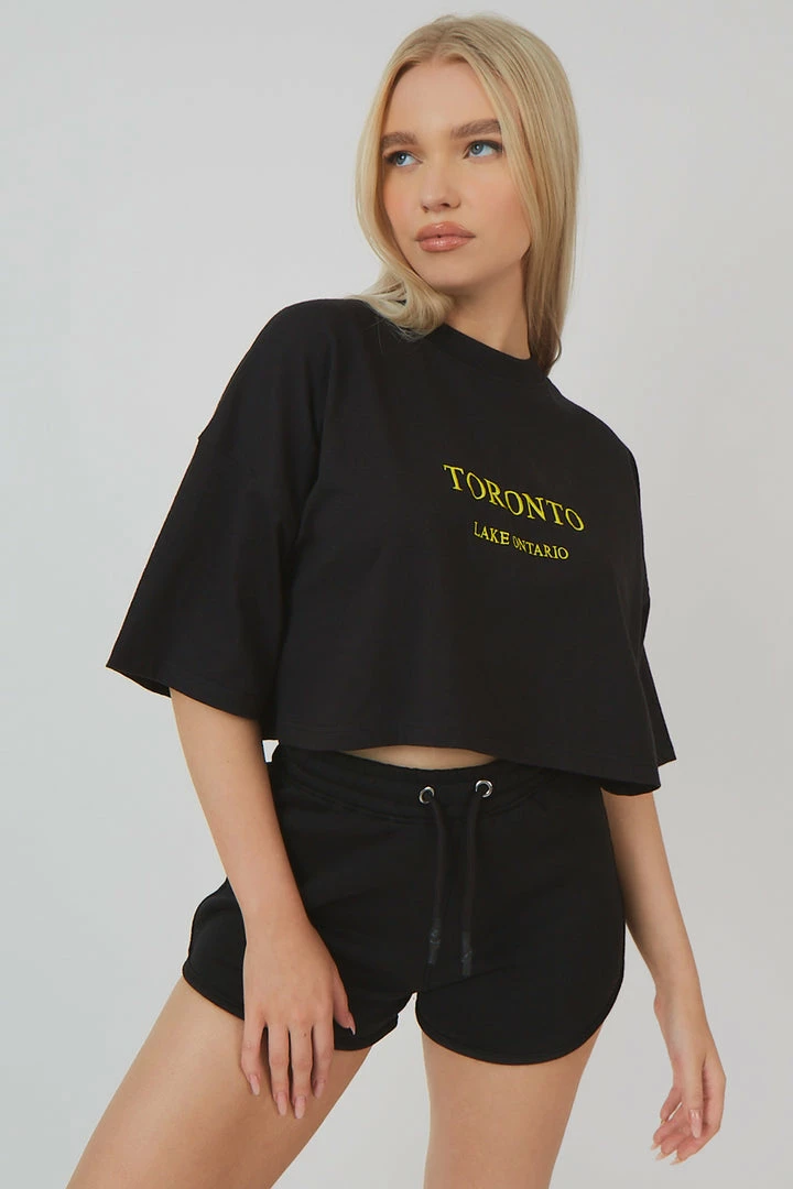A black crop top with short sleeves featuring embroidery.