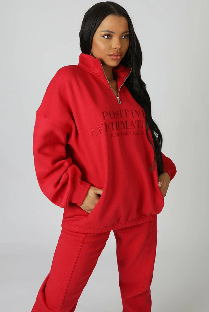 OVERSIZED FIT HALF ZIP SWEATSHIRT IN RED WITH TONAL EMBROIDERY