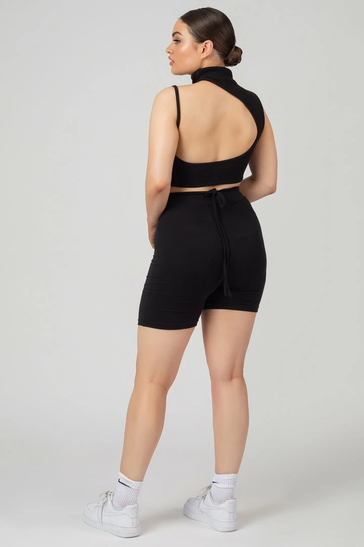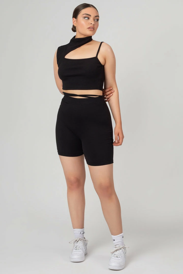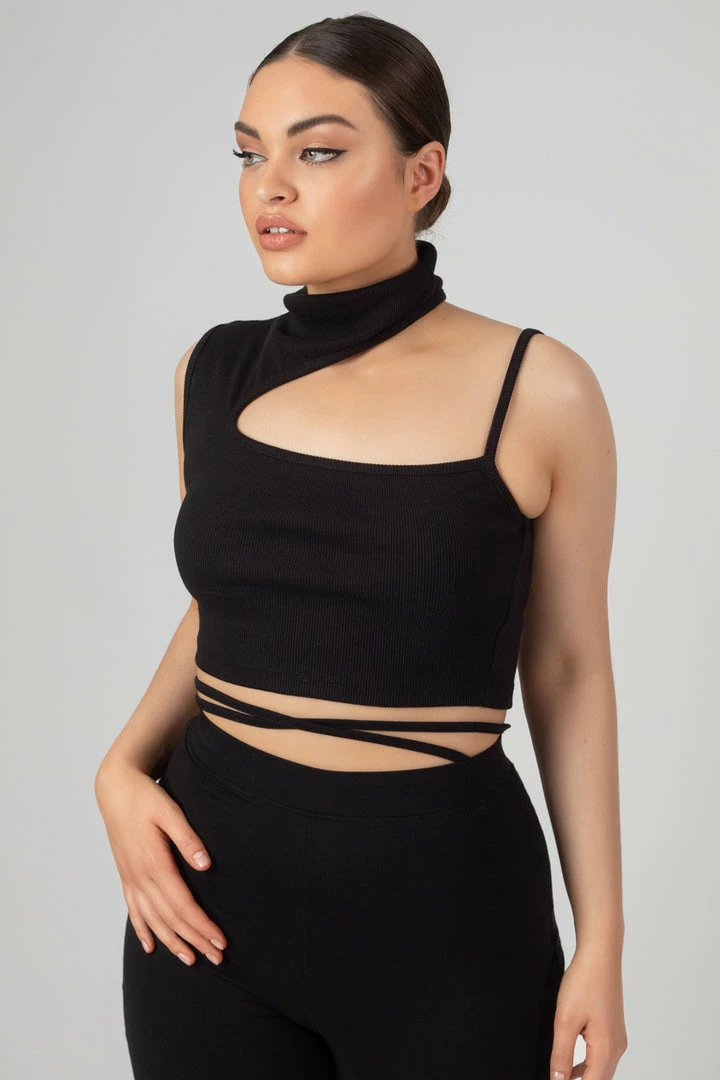 A high neck crop topped in black made of a flattering thick ribbed material featuring a cut out detail on the chest and neck.