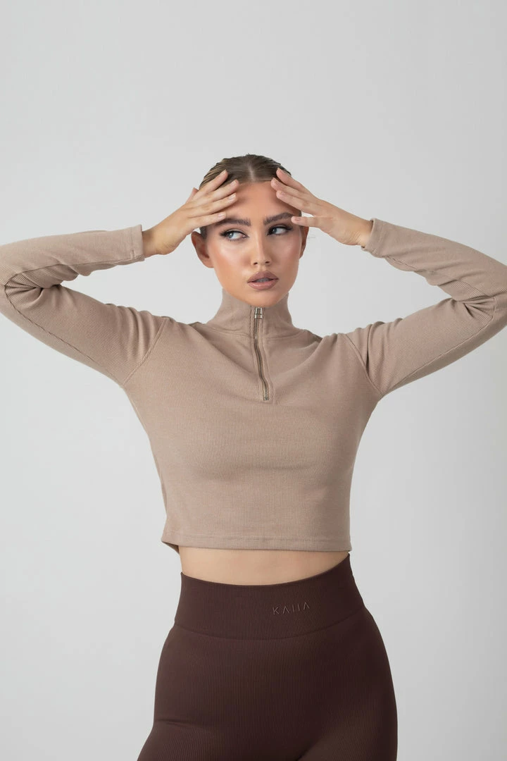 A high neck and long sleeved cropped top in light taupe in a flattering thick ribbed material with a functional half zip