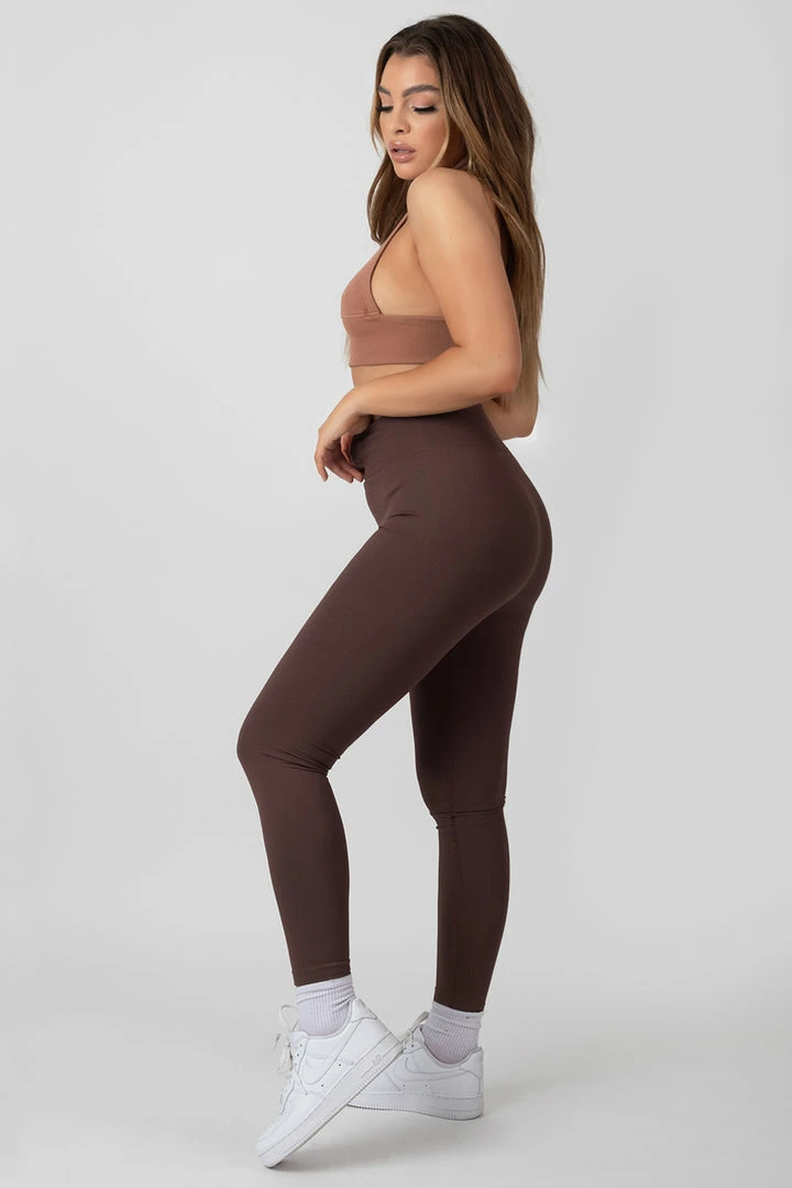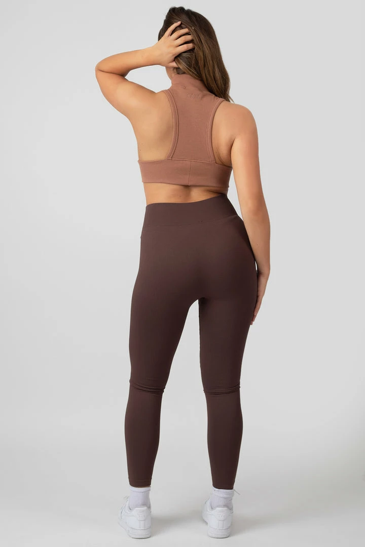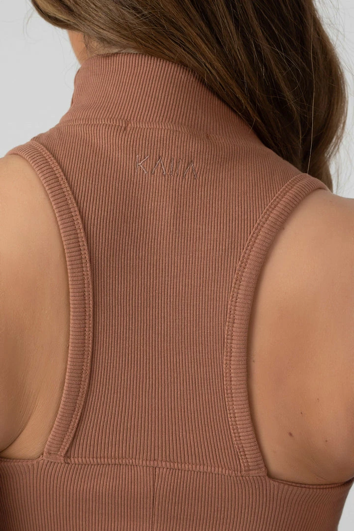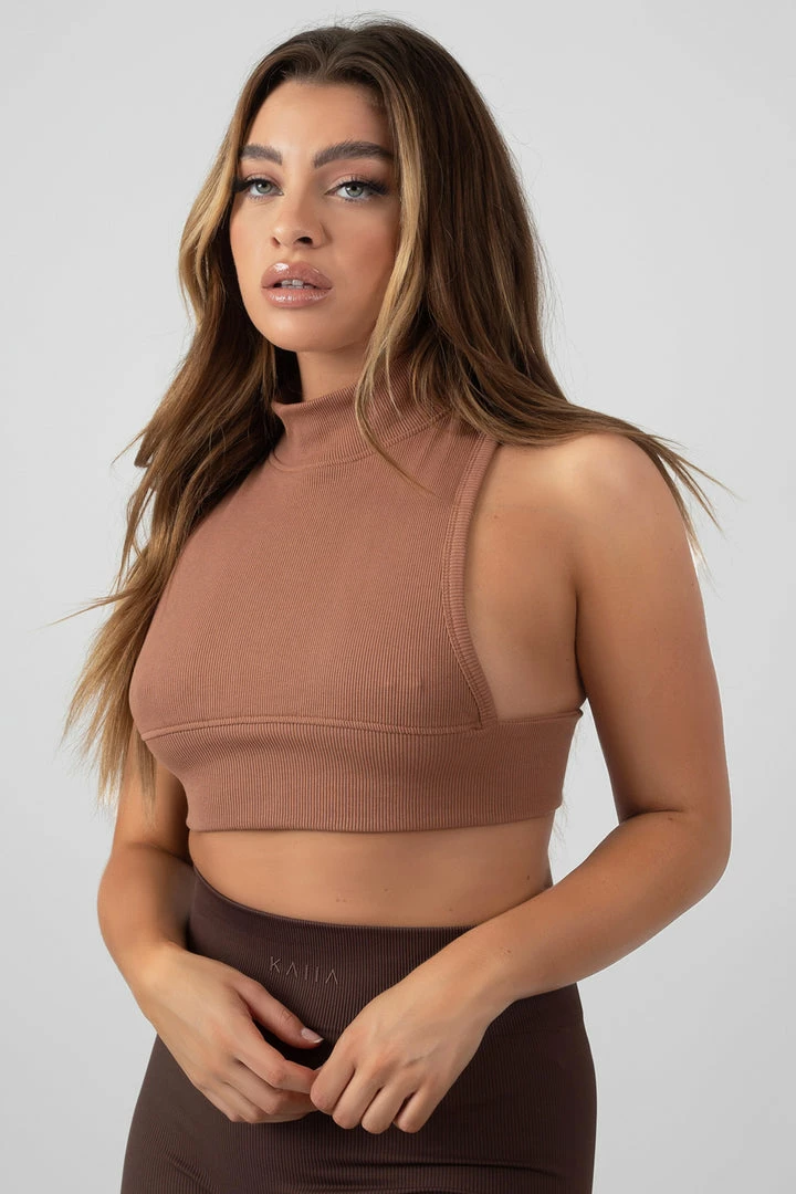 A high neck racer back crop top in cinnamon featuring dropped sides made of a flattering thick ribbed material