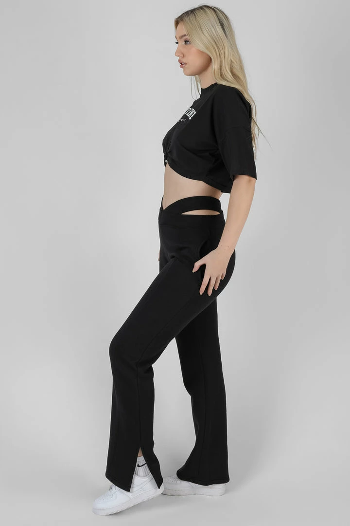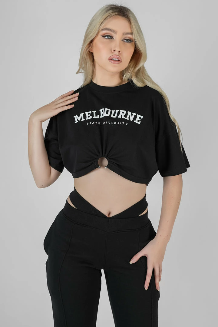 A cropped t-shirt in black with ‘MELBOURNE’ printed on the front and a silver metal bull ring detail on the middle front