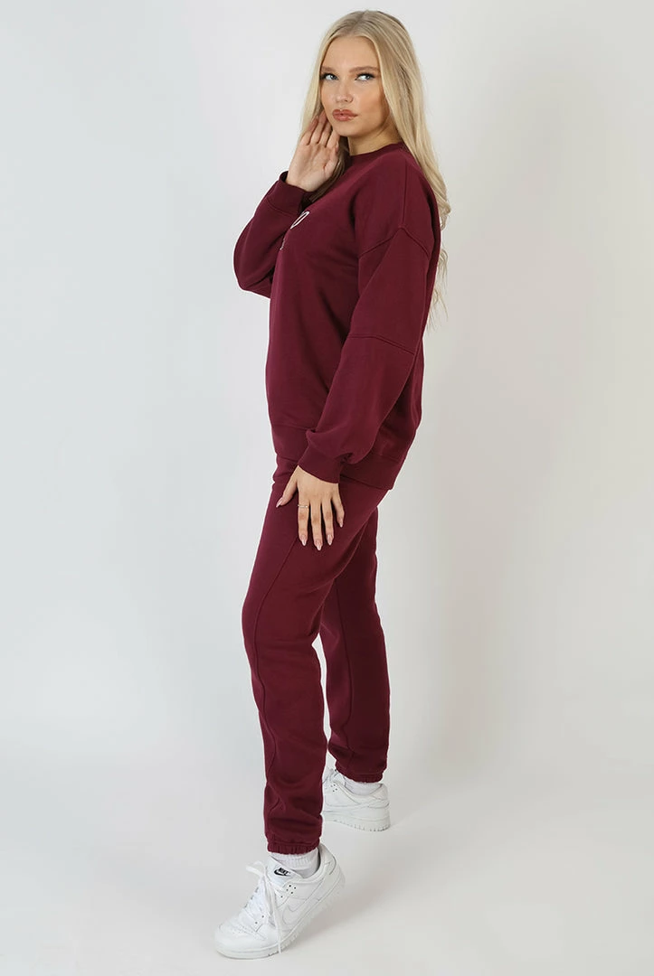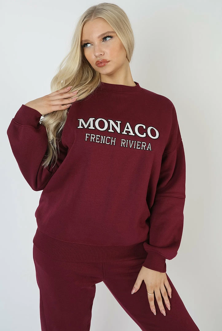 AN OVERSIZED FIT SWEATSHIRT IN BERRY RED WITH MONACO EMBROIDERED ON THE FRONT.