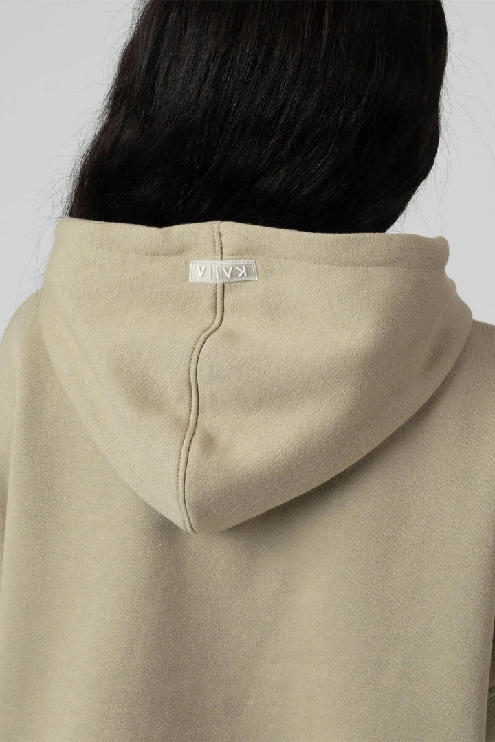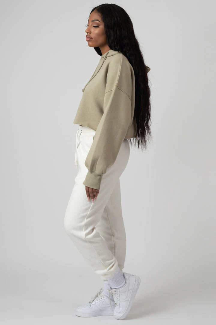 An oversized fit cropped hoodie in light khaki with a raw hem detail and cuffed sleeves