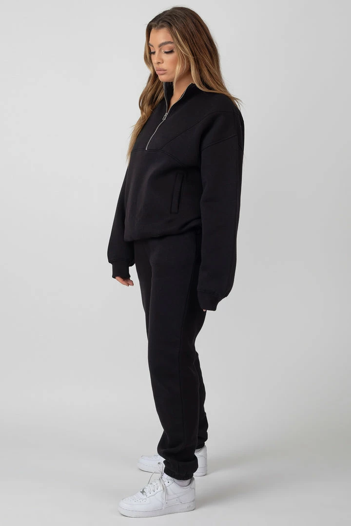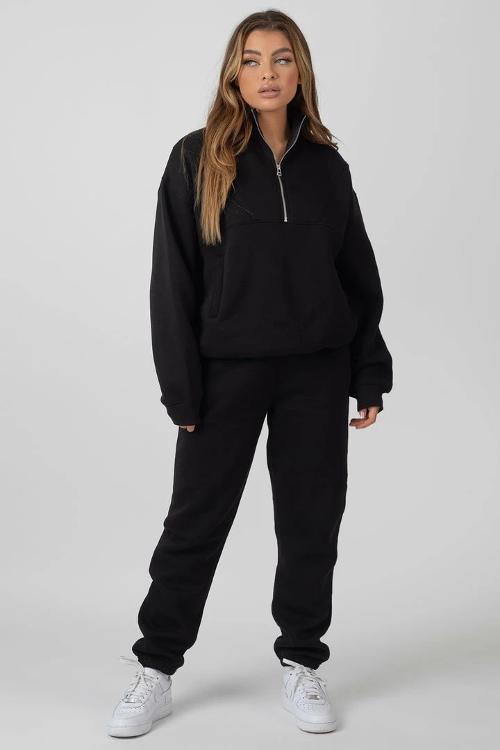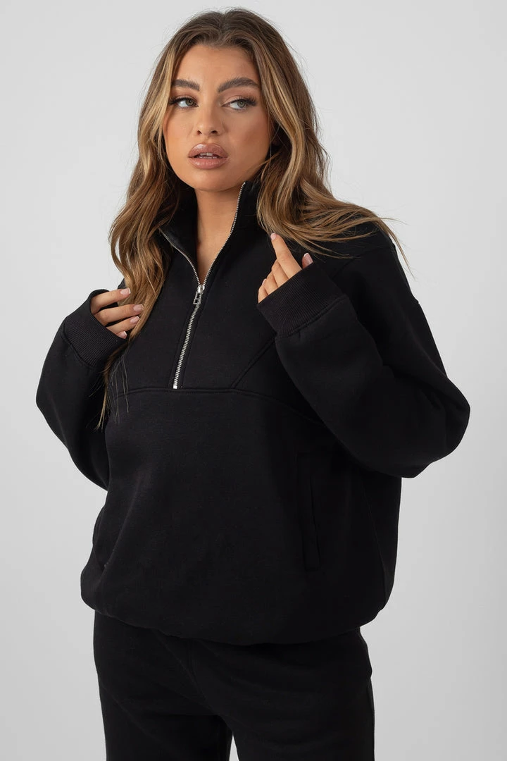 An oversized fit sweatshirt in black featuring a functional half zip and a front pocket