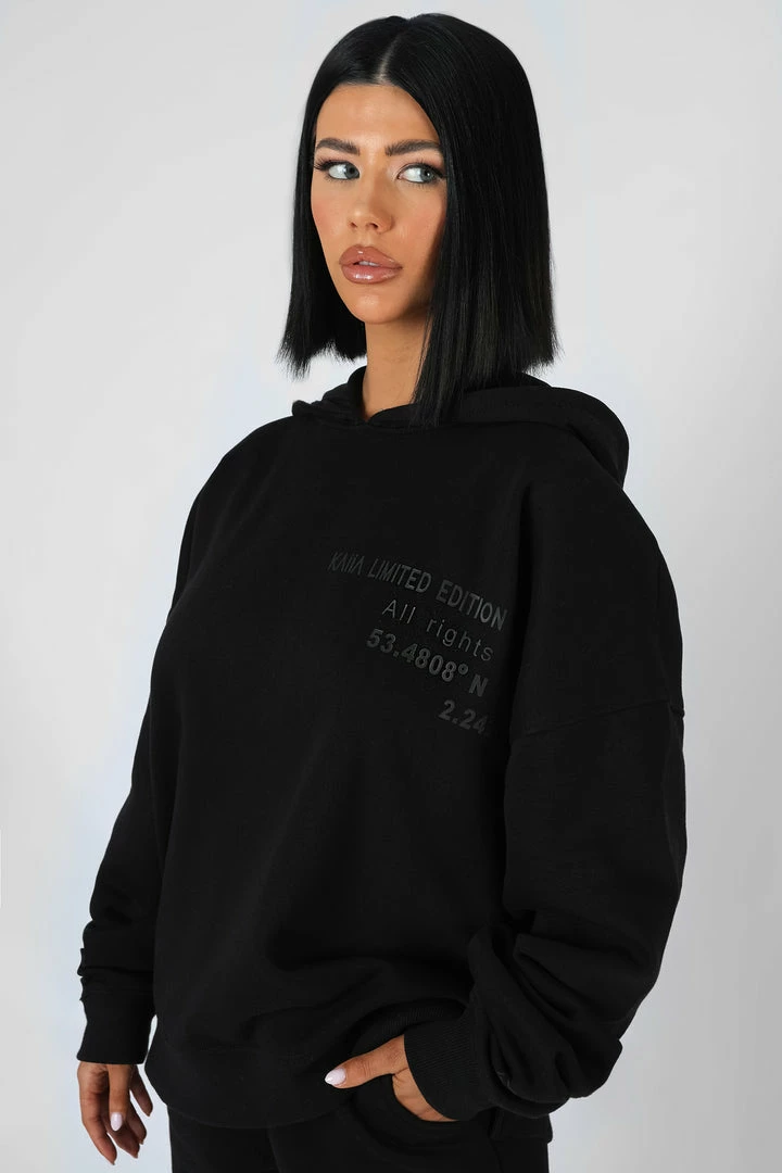 AN OVERSIZED FIT HOODIE IN BLACK WITH OFF-SET TEXT DETAIL IN TONAL BLACK ON THE FRONT. OUR ICONIC ELM TRACKSUIT IN A NEW COLOURWAY.