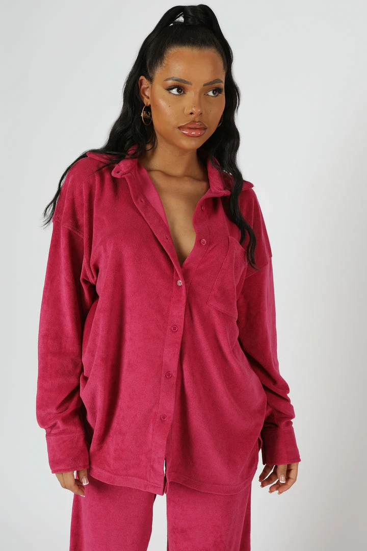 AN OVERSIZED FIT LONG SLEEVE TOWELLING SHIRT IN PINK WITH DYE TO MATCH PURPLE BUTTONS AND A FRONT POCKET. PAIR WITH THE TOWELLING WIDE LEG JOGGERS PINK FOR THE ULTIMATE SET.