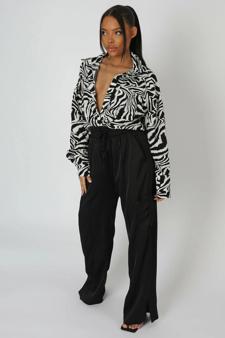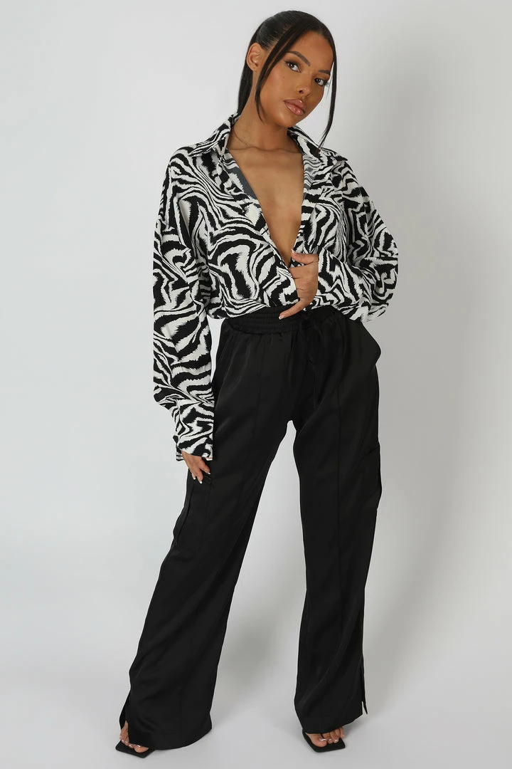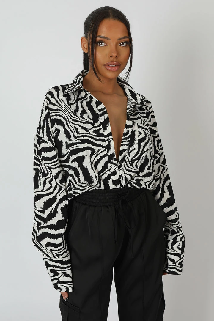 An oversized fit shirt in a black and white psychedelic print.