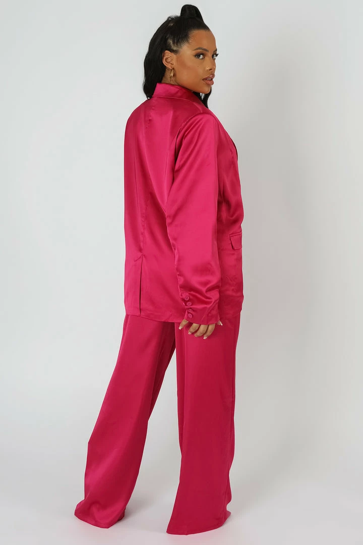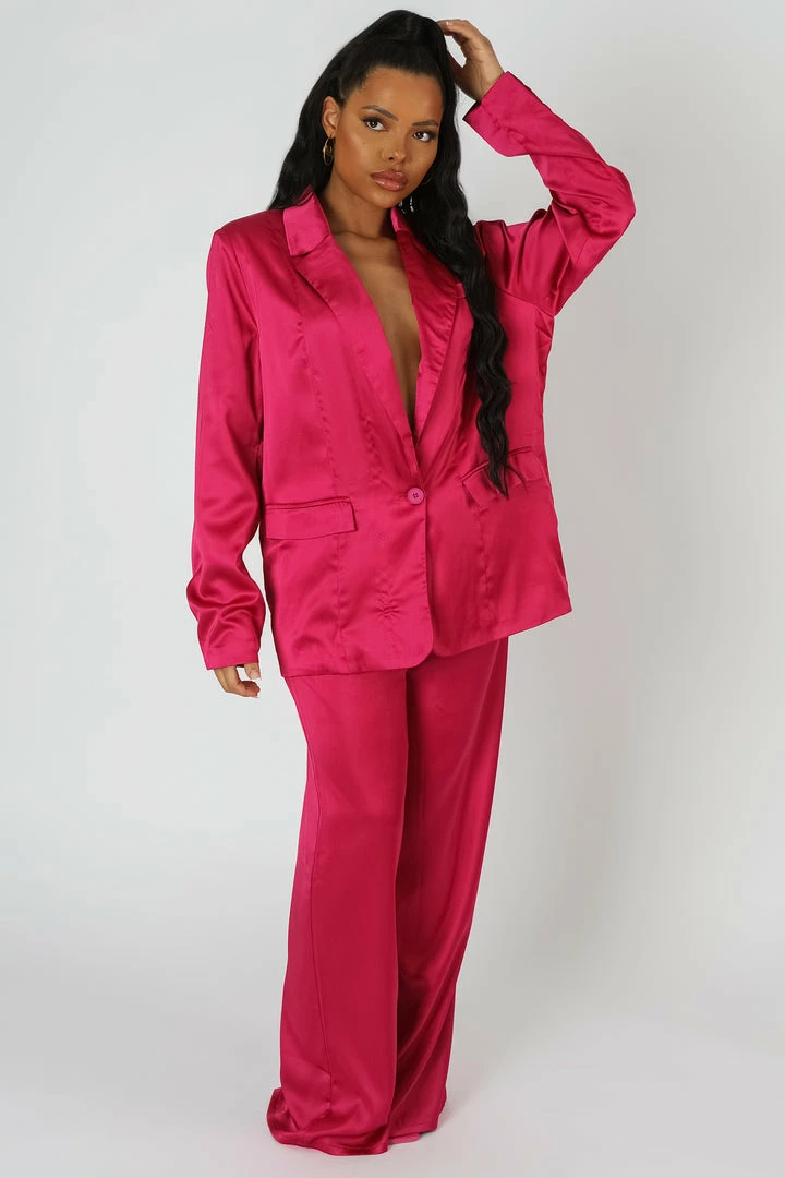AN OVERSIZED DAD STYLE FIT BLAZER IN PINK SATIN WITH DYE TO MATCH BUTTONS.