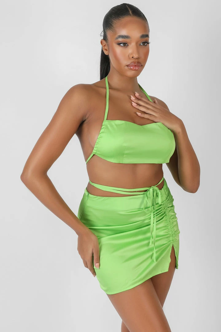 A green satin mini skirt featuring a front split, side ruching and a strappy waist detail.