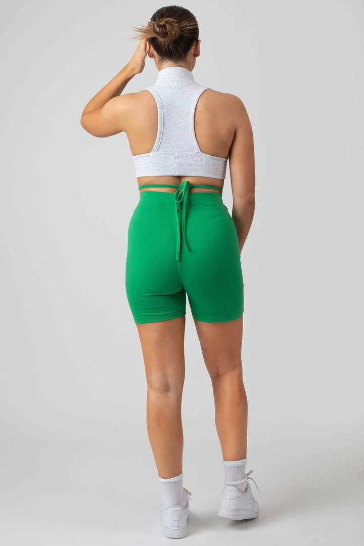 HIGH WAISTED CYCLING SHORTS IN GREEN FEATURING A STRAP TIE WAIST DETAIL.