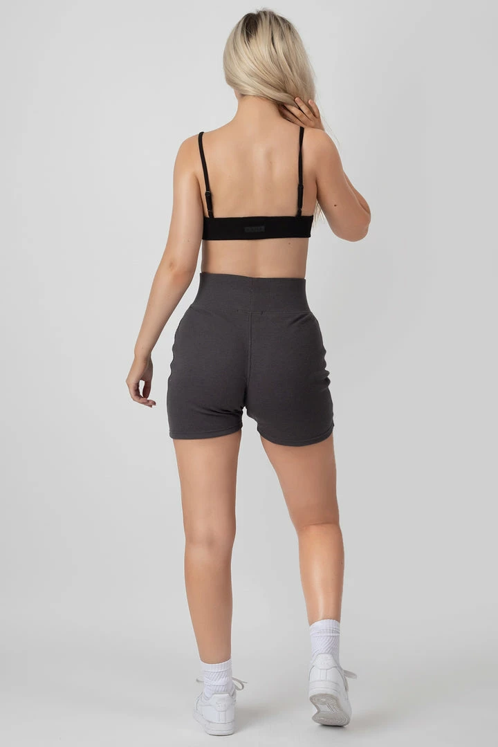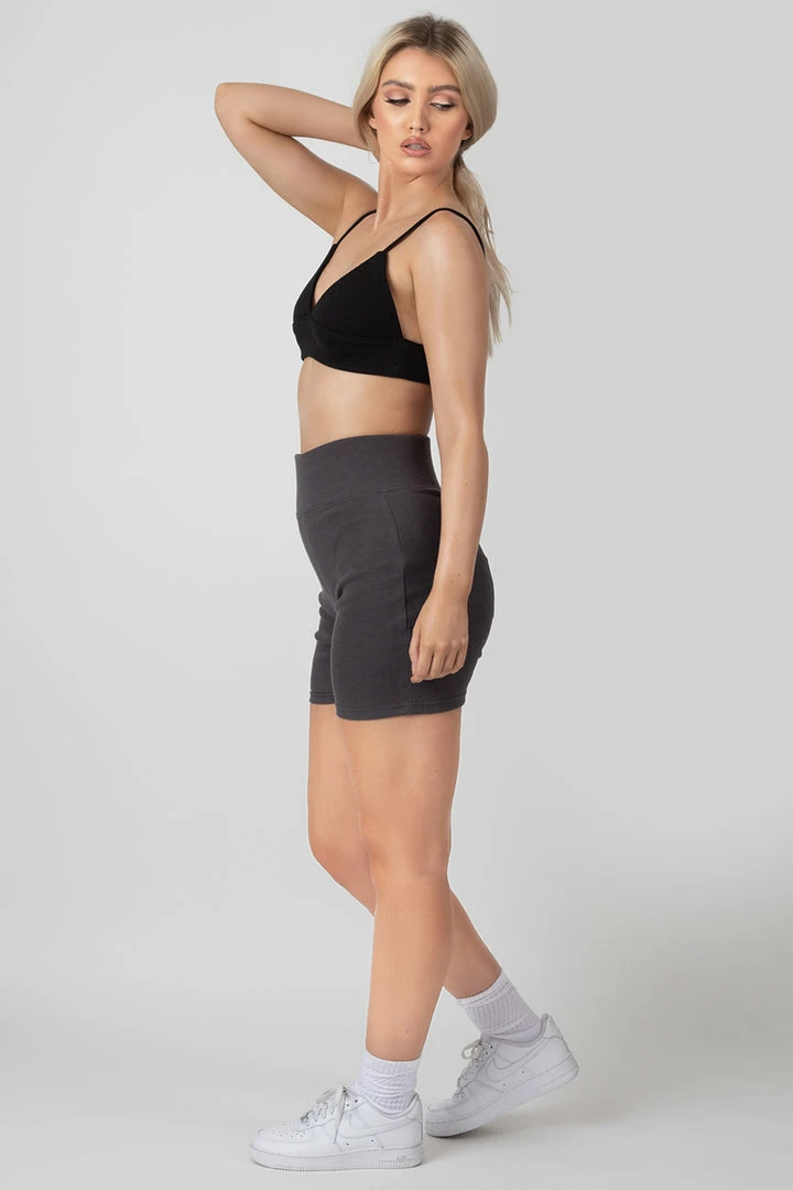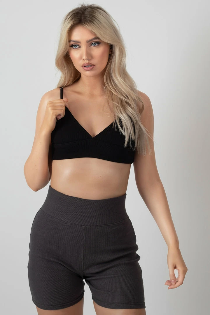 A bralet in a triangle shape made of a thick ribbed material in black