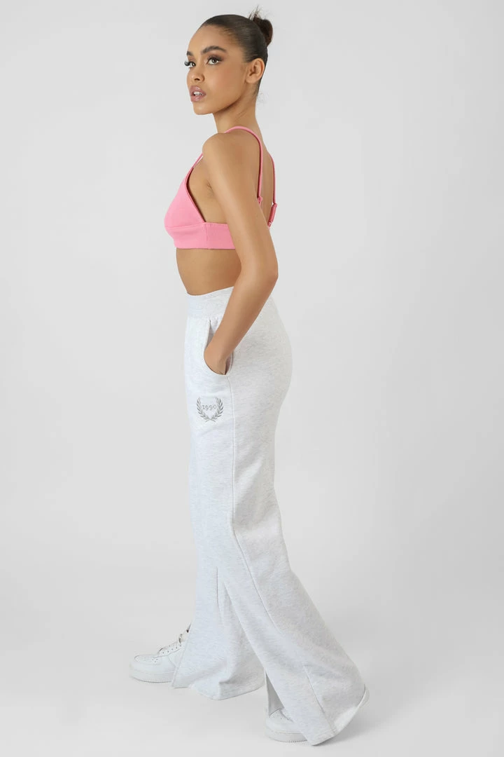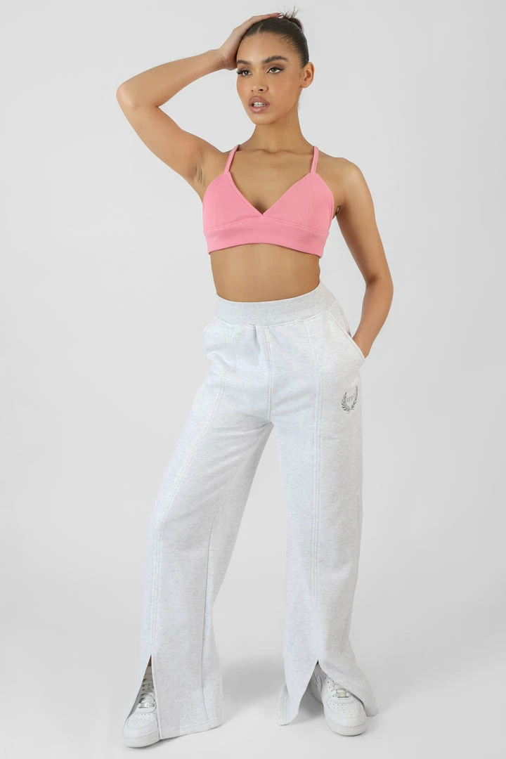 A bralet in a triangle shape made of a thick ribbed material in pink