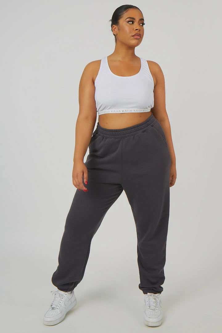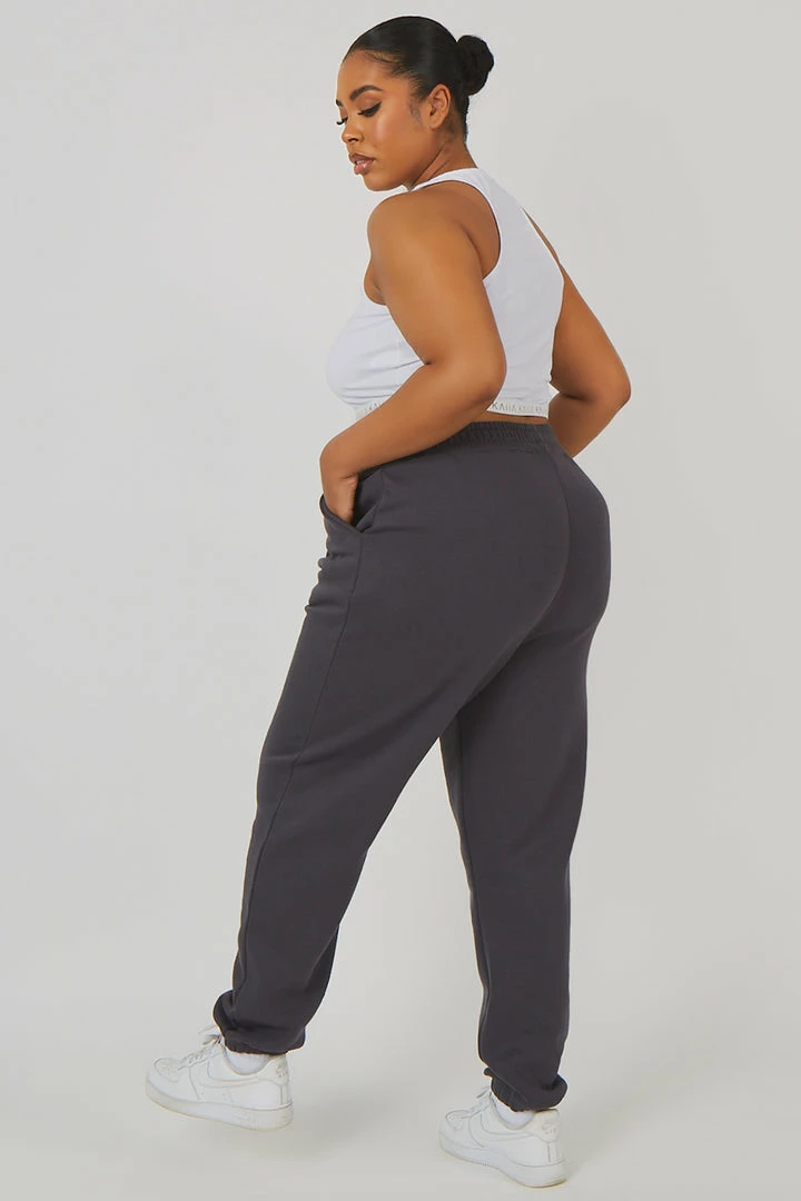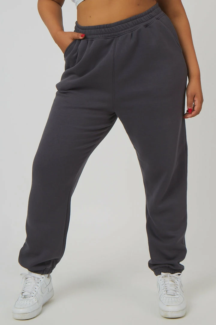 THE PERFECT BASIC HIGH WAISTED JOGGERS IN DARK GREY WITH AN ELASTICATED WAIST AND CUFFS