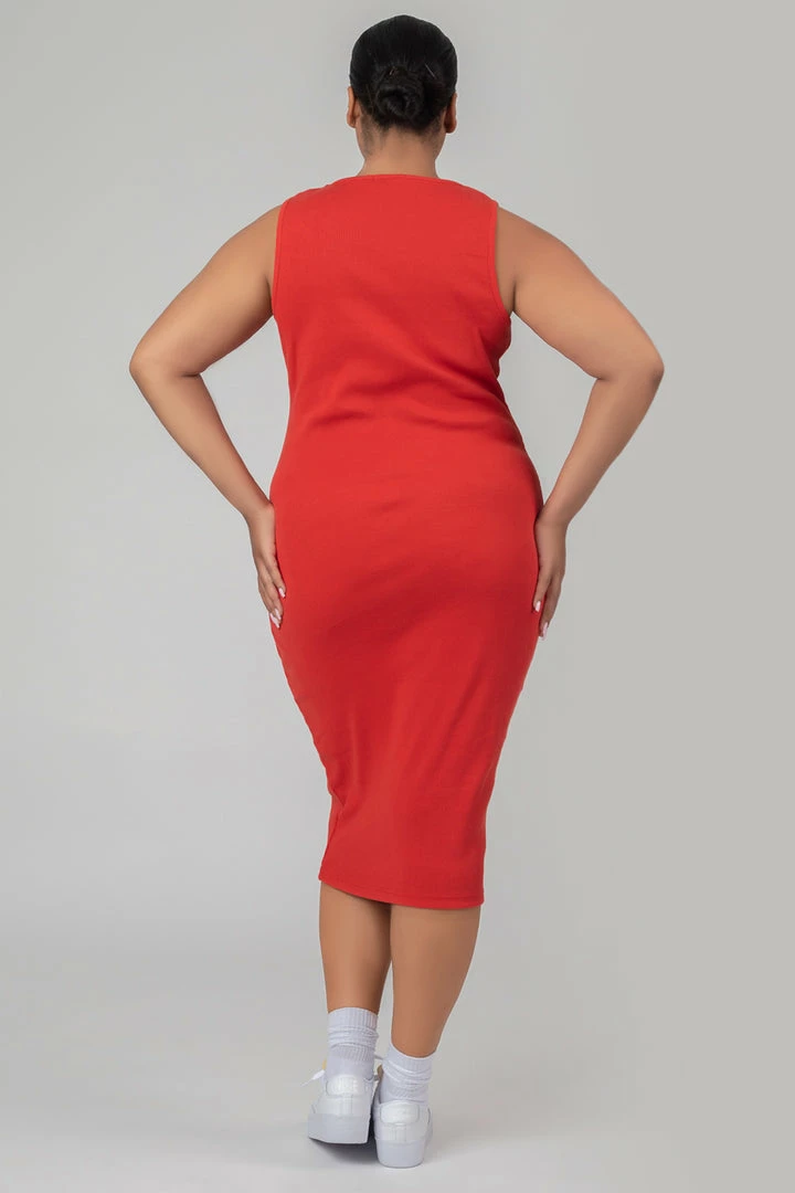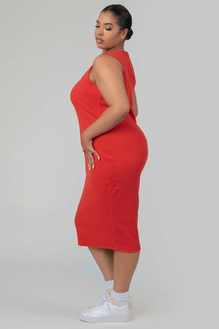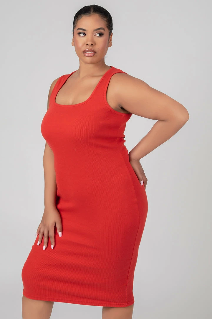 A RIBBED midi dress with thick straps and a scoop neckline in RED.