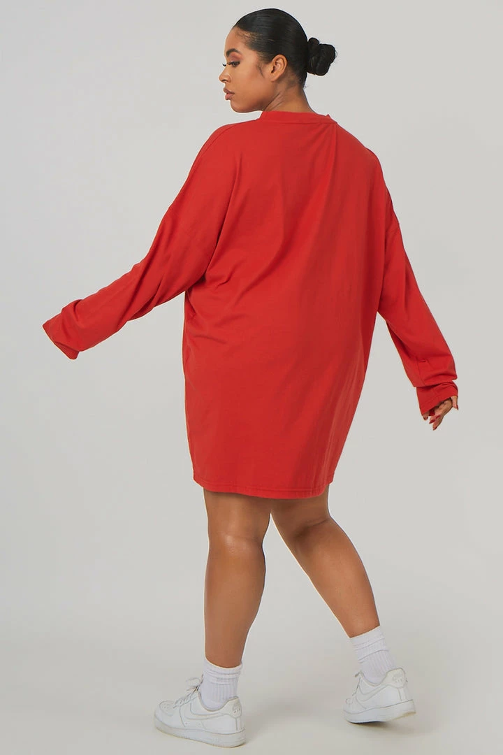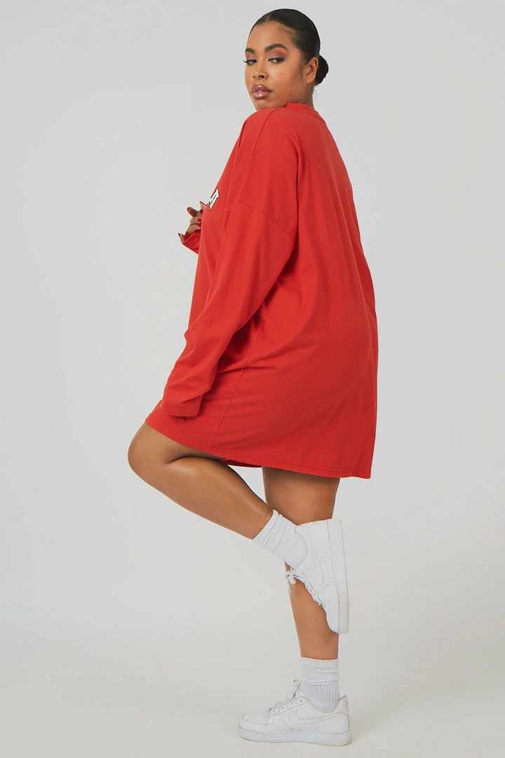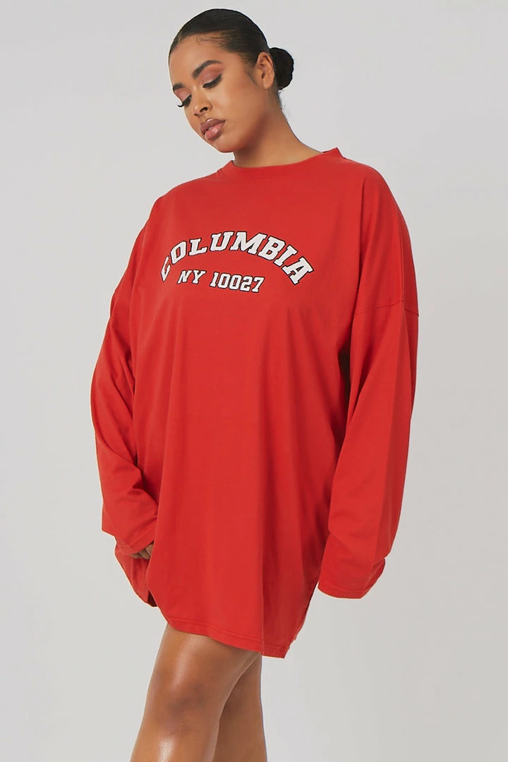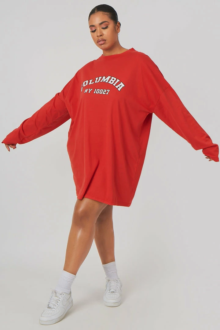 Long sleeve oversized fit t-shirt dress in red with ‘COLUMBIA’ written on it