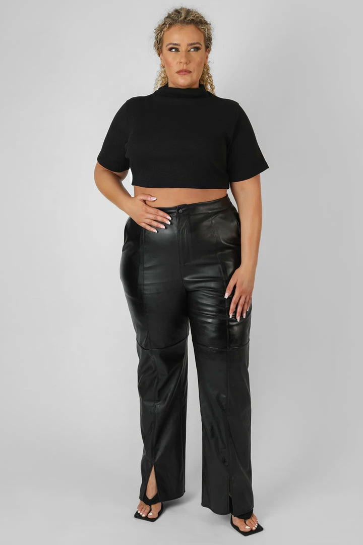 A high neck crop top in black made of a flattering ribbed material with short sleeves.