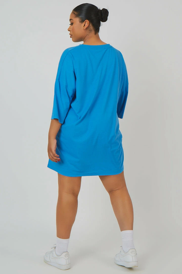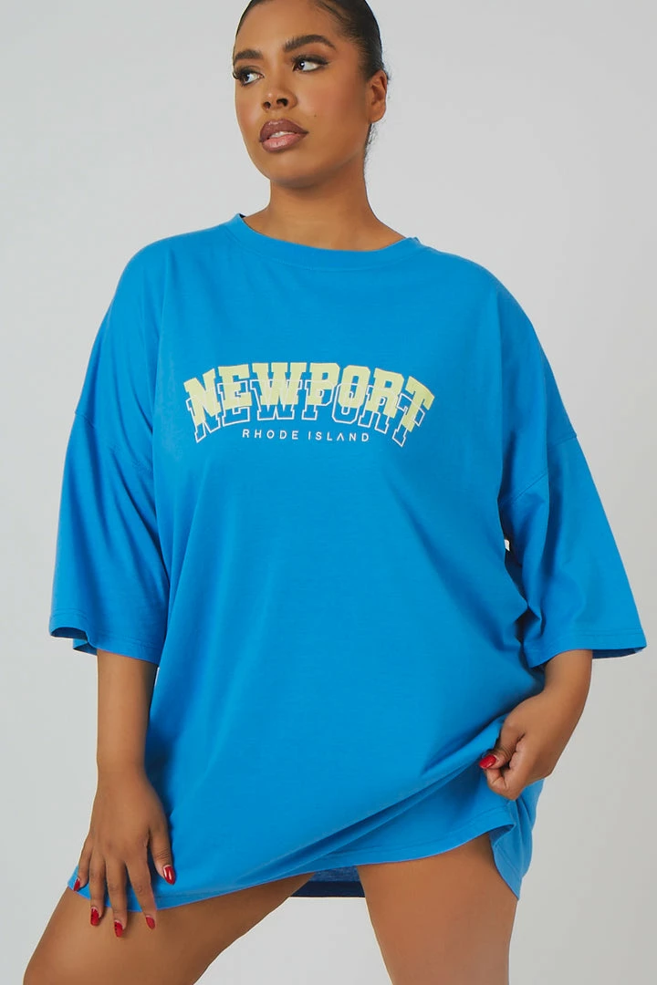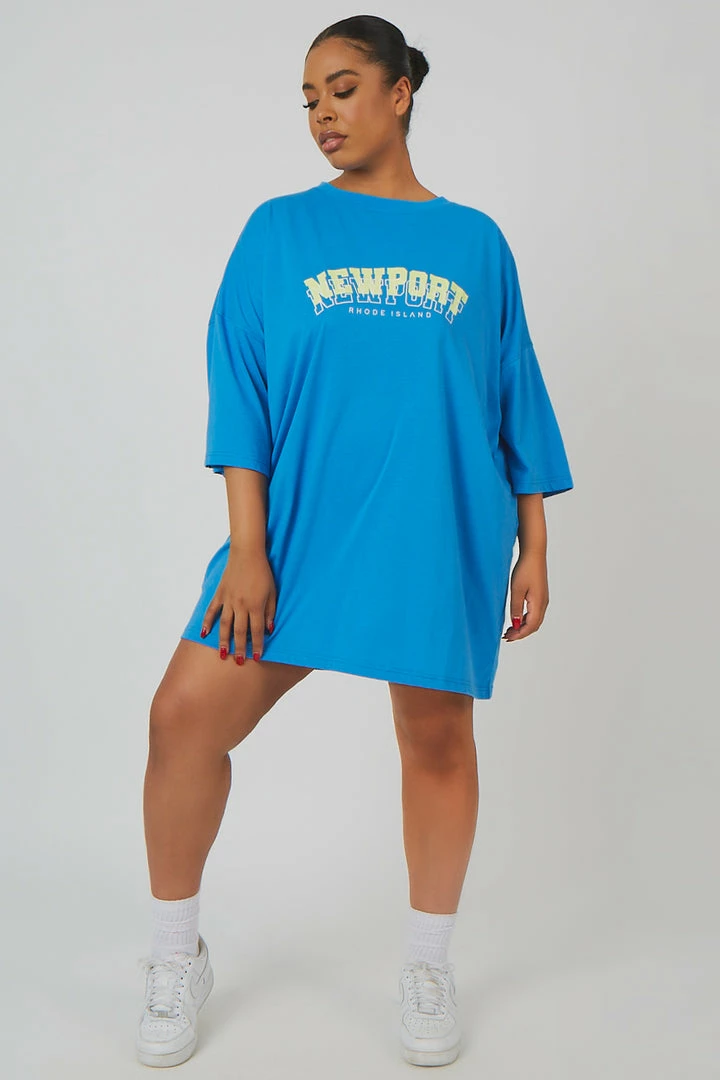 A blue oversized fit t-shirt dress with short sleeves and ‘NEWPORT’ printed on