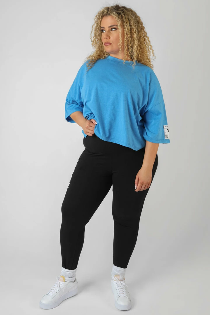 A t-shirt with an oversized fit and short sleeves in blue featuring detailing on the sleeve.