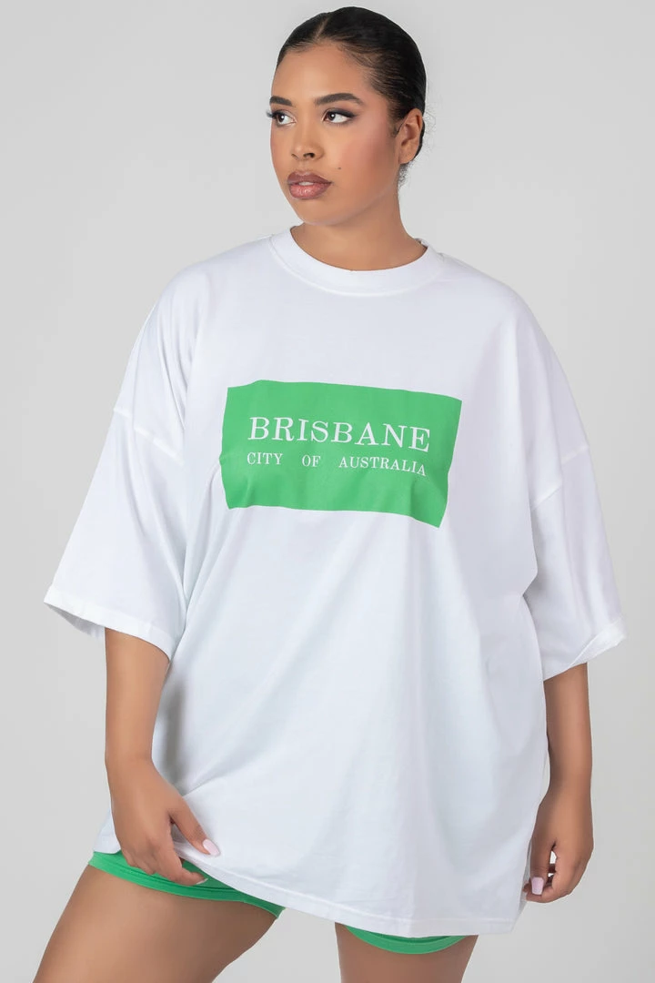 An oversized fit short sleeve t-shirt in white with a green block printed on and ‘BRISBANE’ written on it.