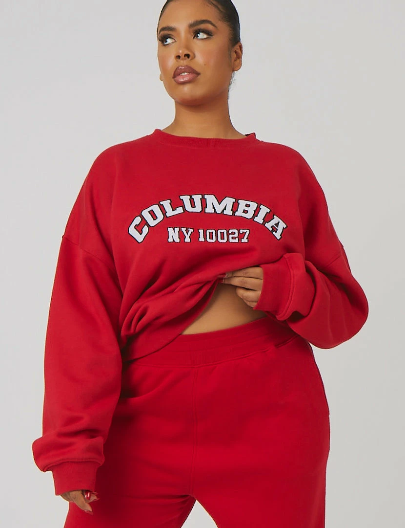 An oversized fit sweatshirt in red with ‘COLUMBIA’ embroidered on