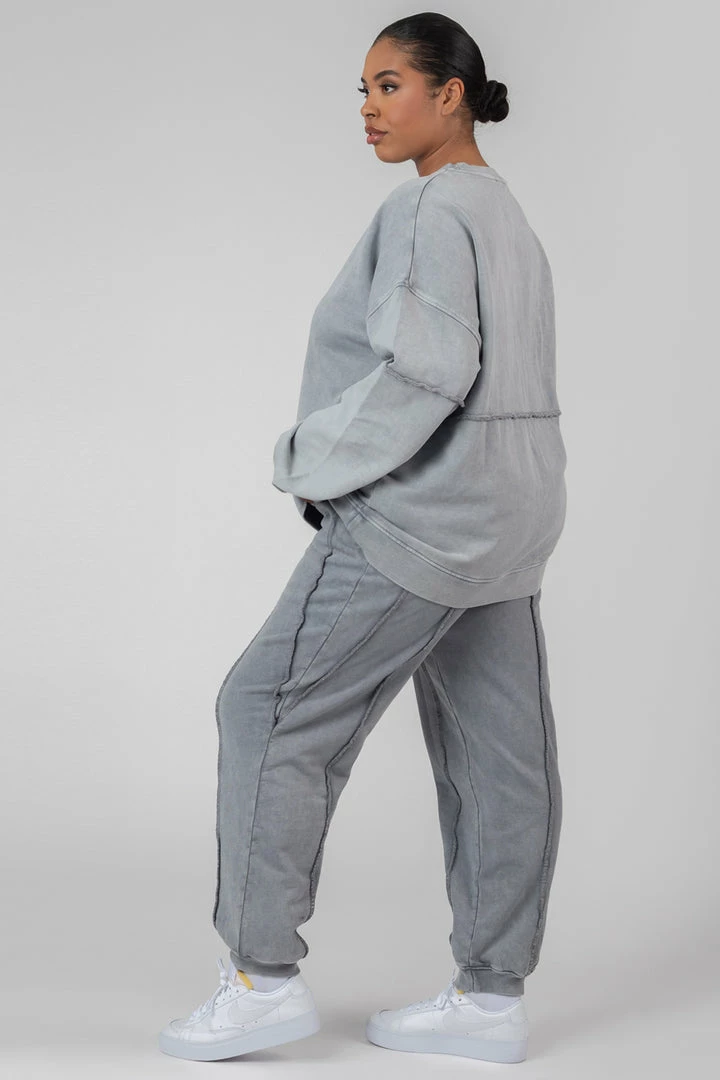 An oversized fit sweatshirt with an acid wash effect and raw edge seam details.