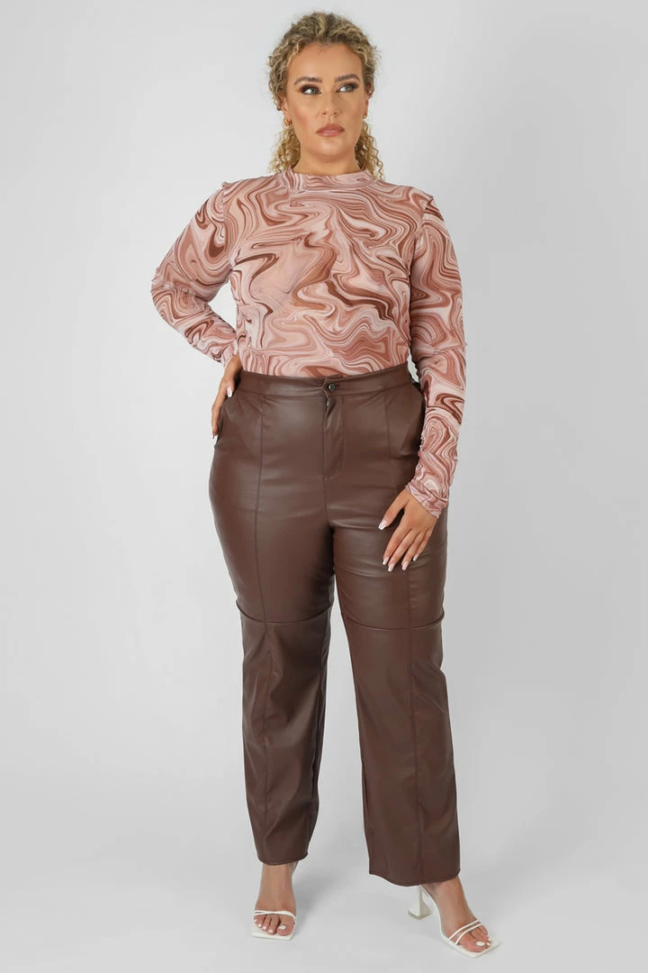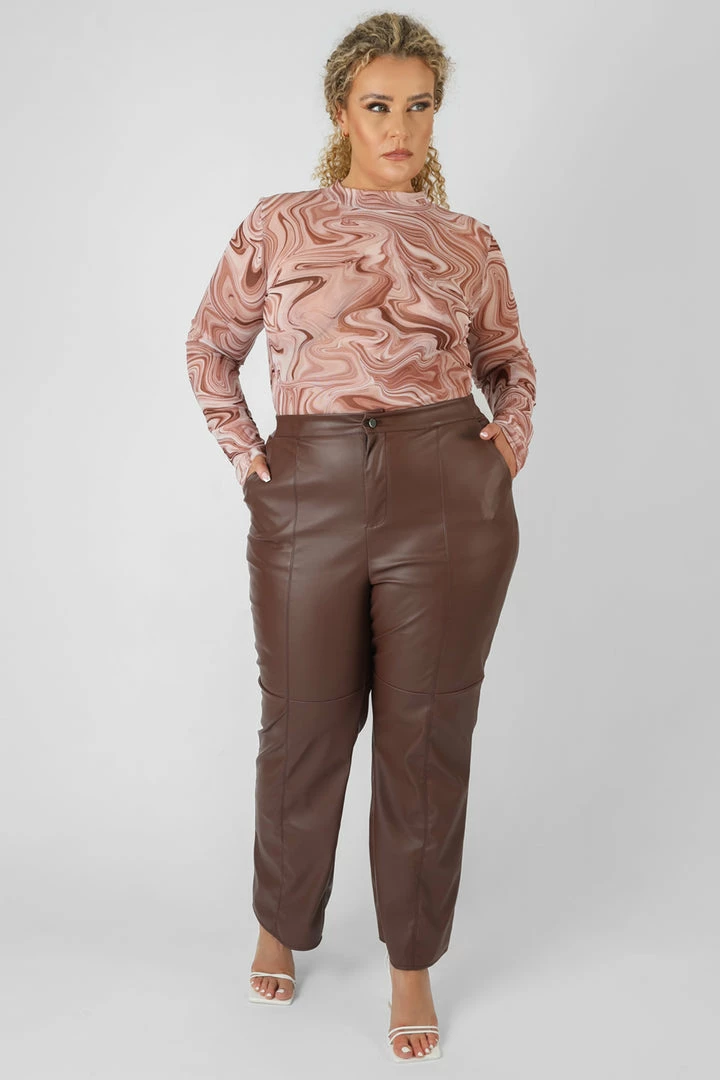 A HIGH NECK BODYSUIT WITH LONG SLEEVES IN A PRINTED CHOCOLATE SWIRLY MESH PATTERN.